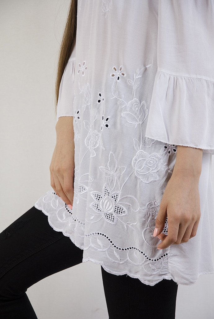 Biała bluzka z  szerokim ściągaczem w dekolcie