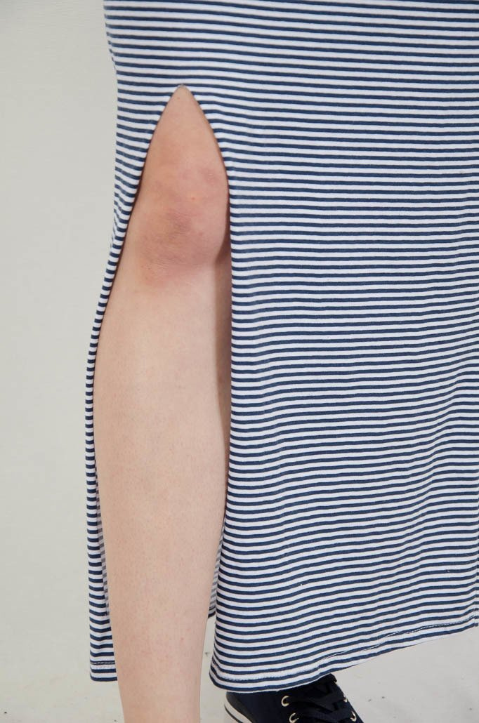Długa sukienka w cienkie biało-granatowe paski, wiązana w pasie