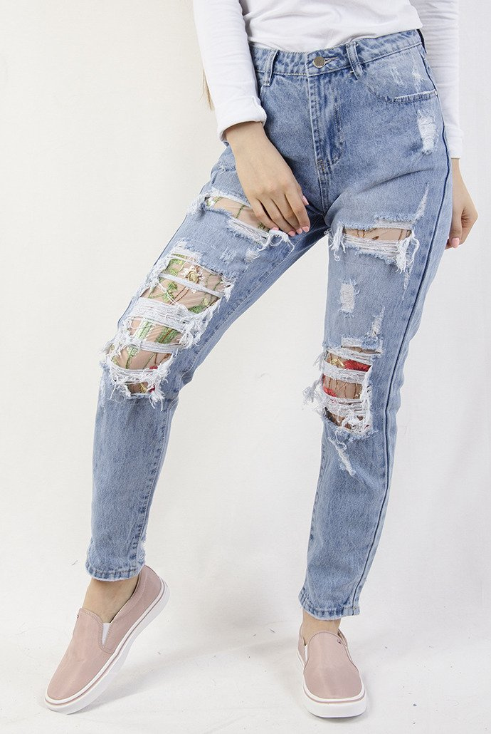 Spodnie jeansowe typu boyfriend z haftowanymi wstawkami