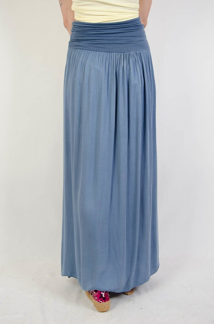 Długa zwiewna niebieska spódnica z szerokim pasem