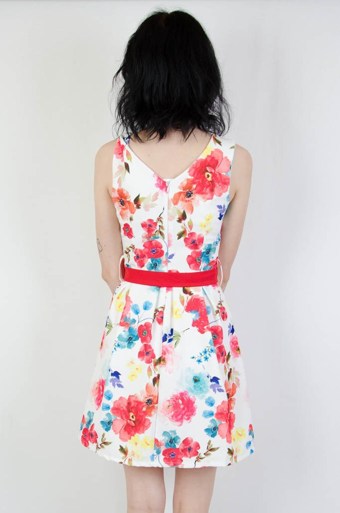 BIAŁA SUKIENKA W KOLOROWE KWIATY Z PASKIEM W TALII