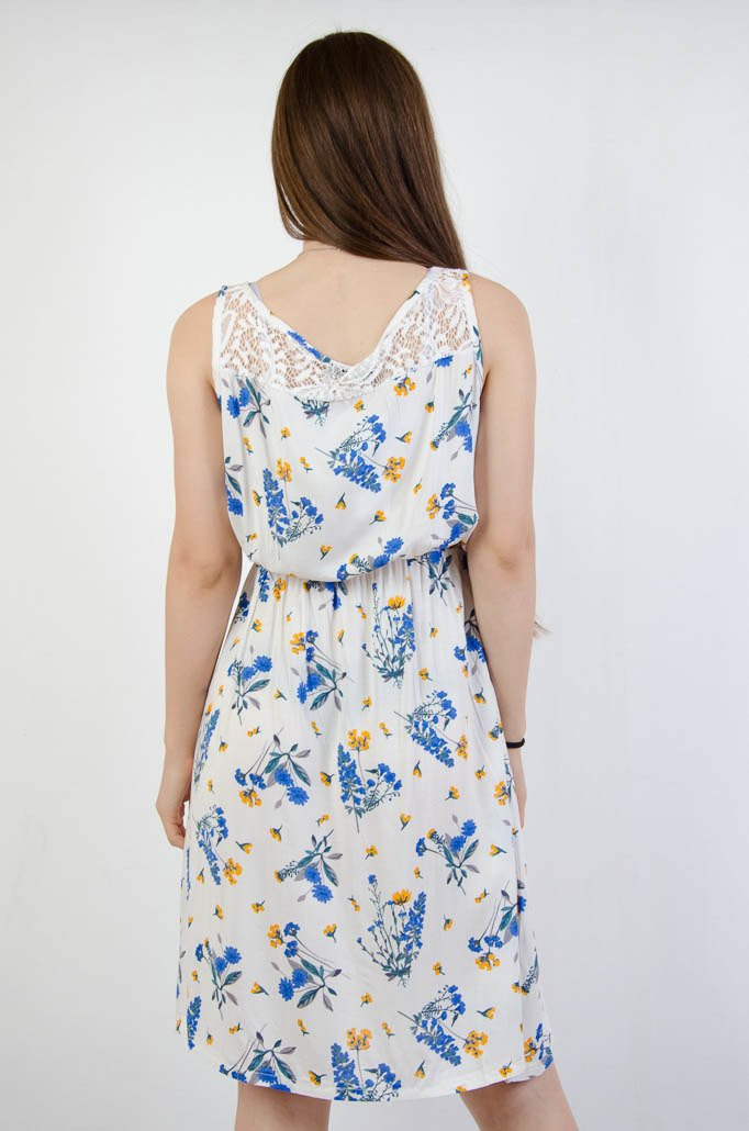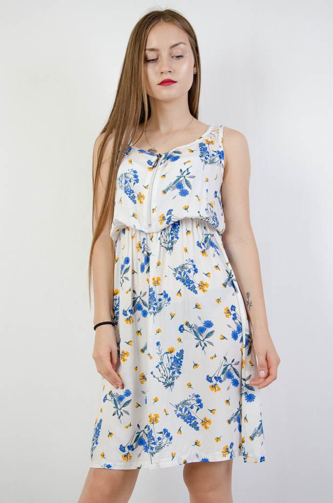 Zwiewna biało niebieska sukienka z gumką w pasie