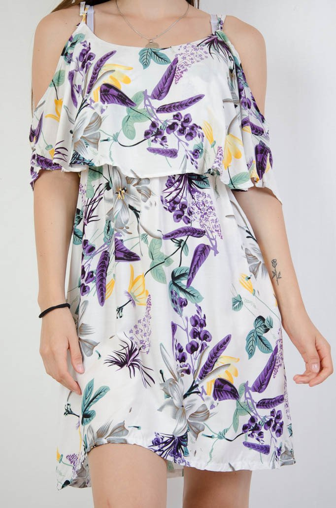 Biała sukienka w kwiaty z hiszpańskim dekoltem