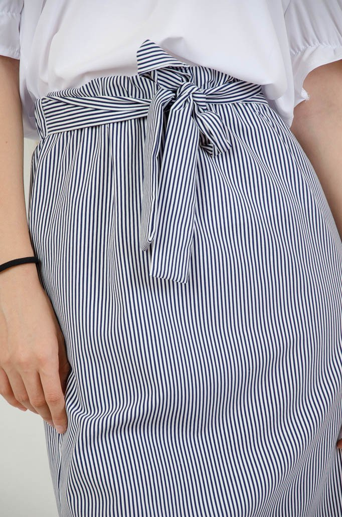 BIAŁO GRANATOWA SPÓDNICA W PASKI Z WIĄZANIEM W PASIE