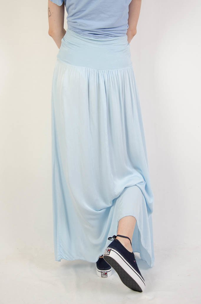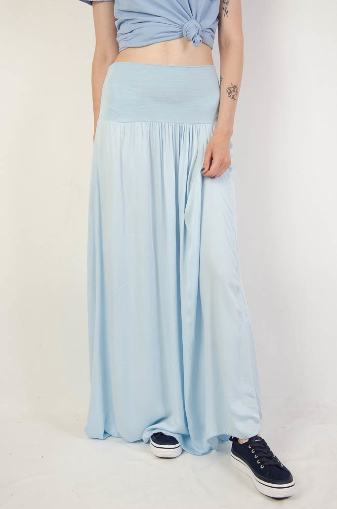 Długa zwiewna jasnoniebieska spódnica z szerokim pasem