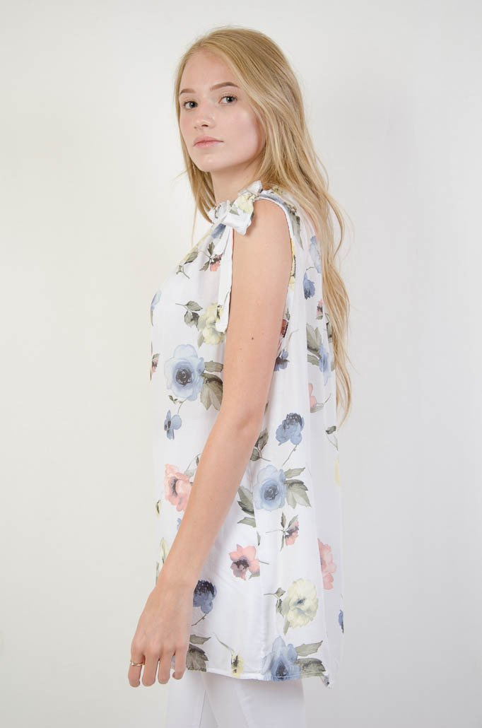 ZWIEWNA BLUZKA W KWIATY Z WIĄZANIEM NA RAMIENIU