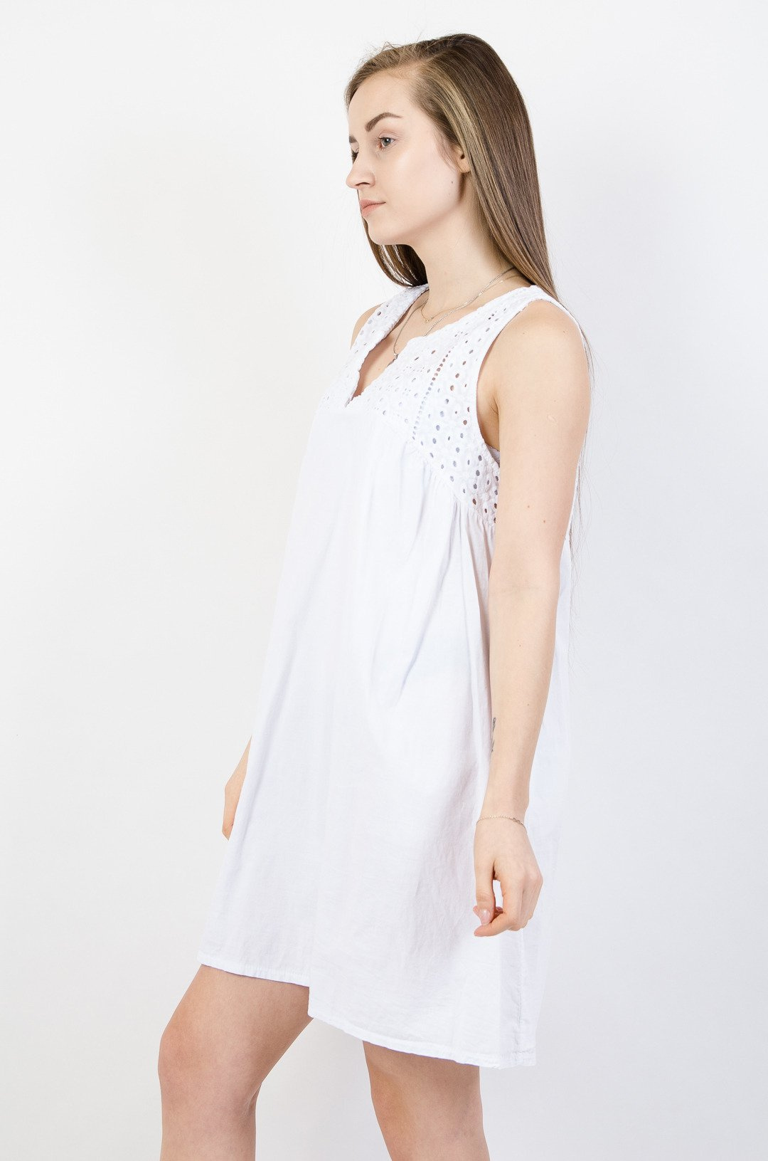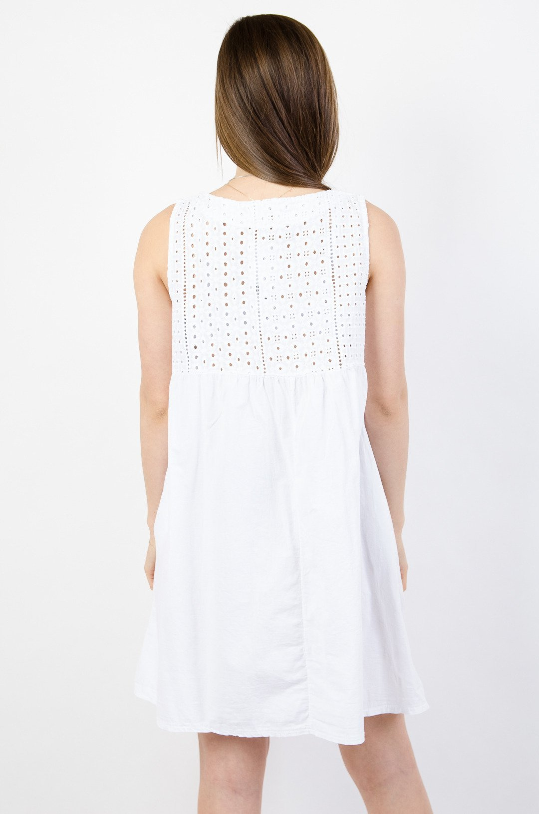 Biała trapezowa sukienka z ażurowymi wstawkami