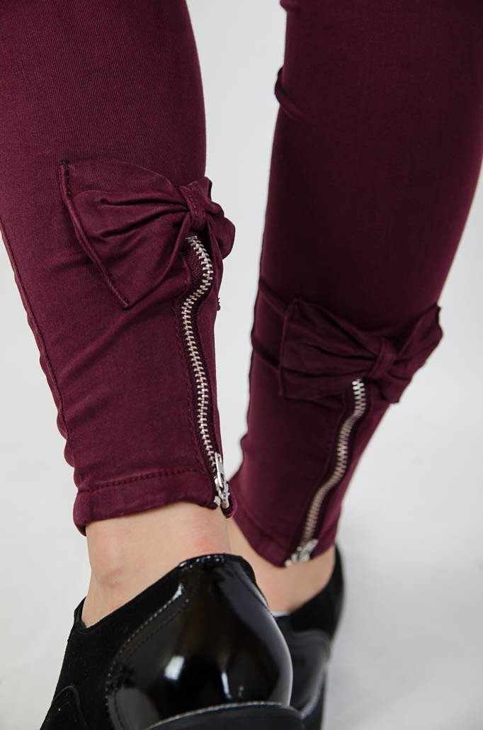 Bordowe spodnie jeansowe z zamkiem na nogawce oraz kokardą