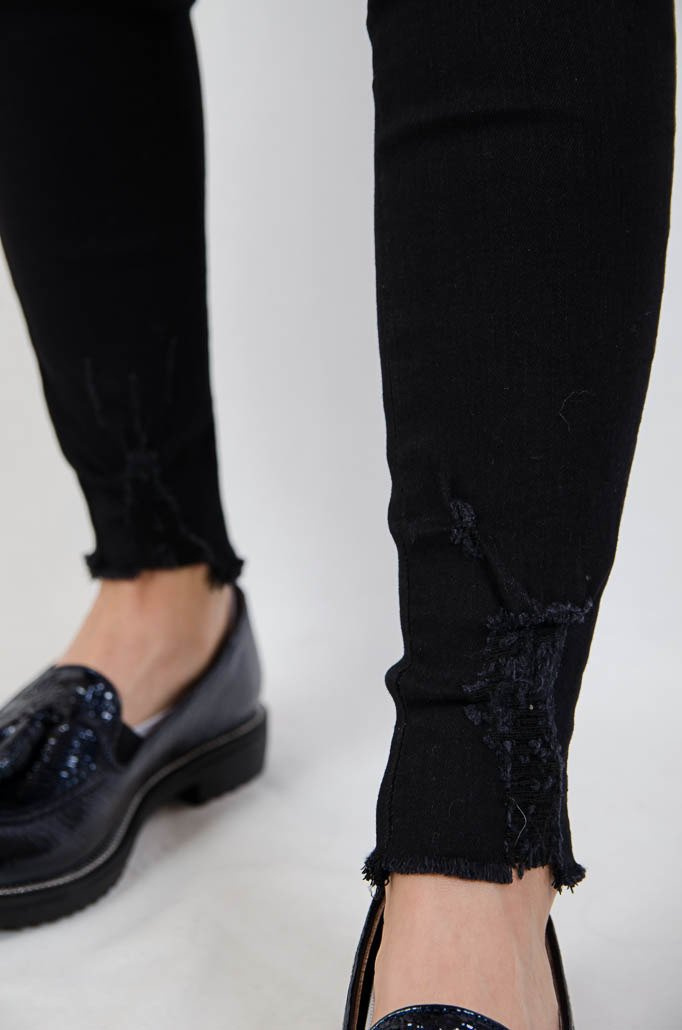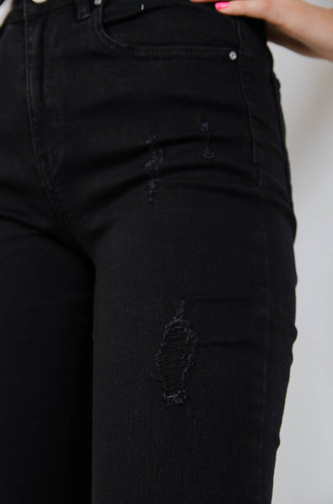 Czarne jeansowe spodnie z przetarciami oraz szarpaniem na dole nogawki