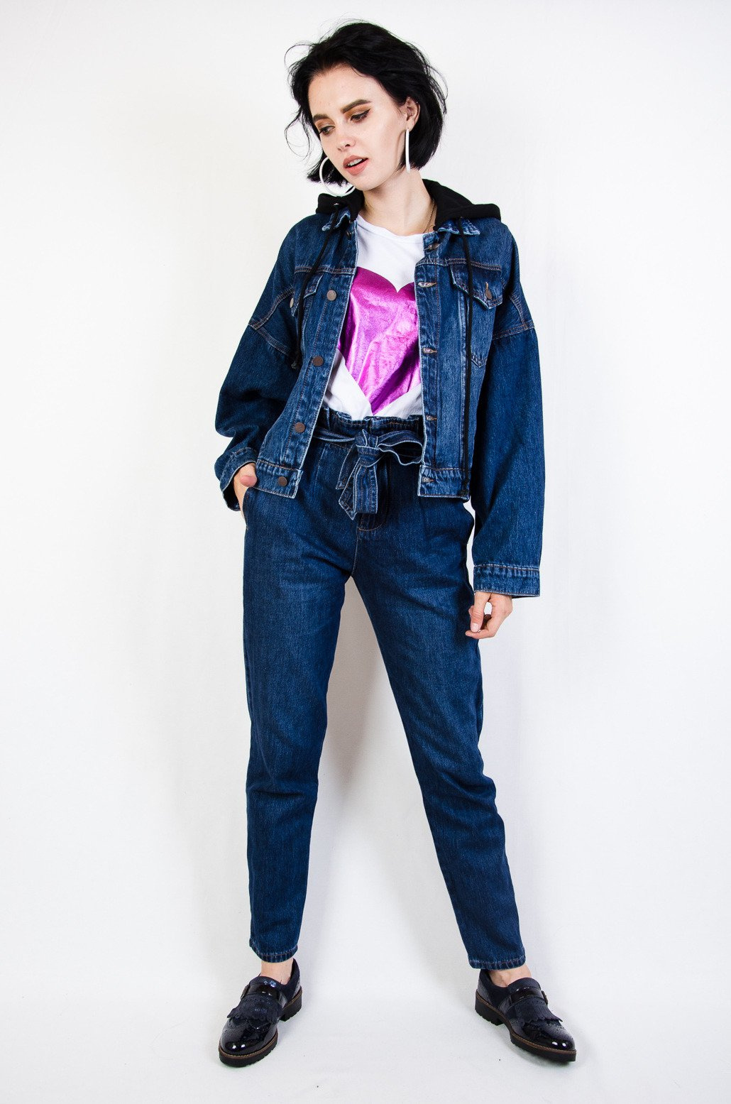 Ciemna kurtka jeansowa z kapturem oraz ściągaczem na dole