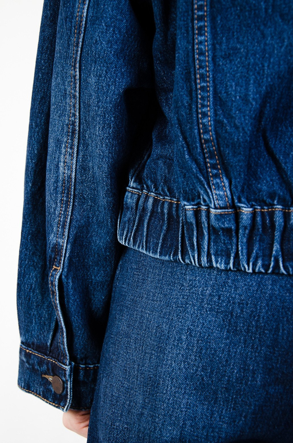 Ciemna kurtka jeansowa z kapturem oraz ściągaczem na dole.