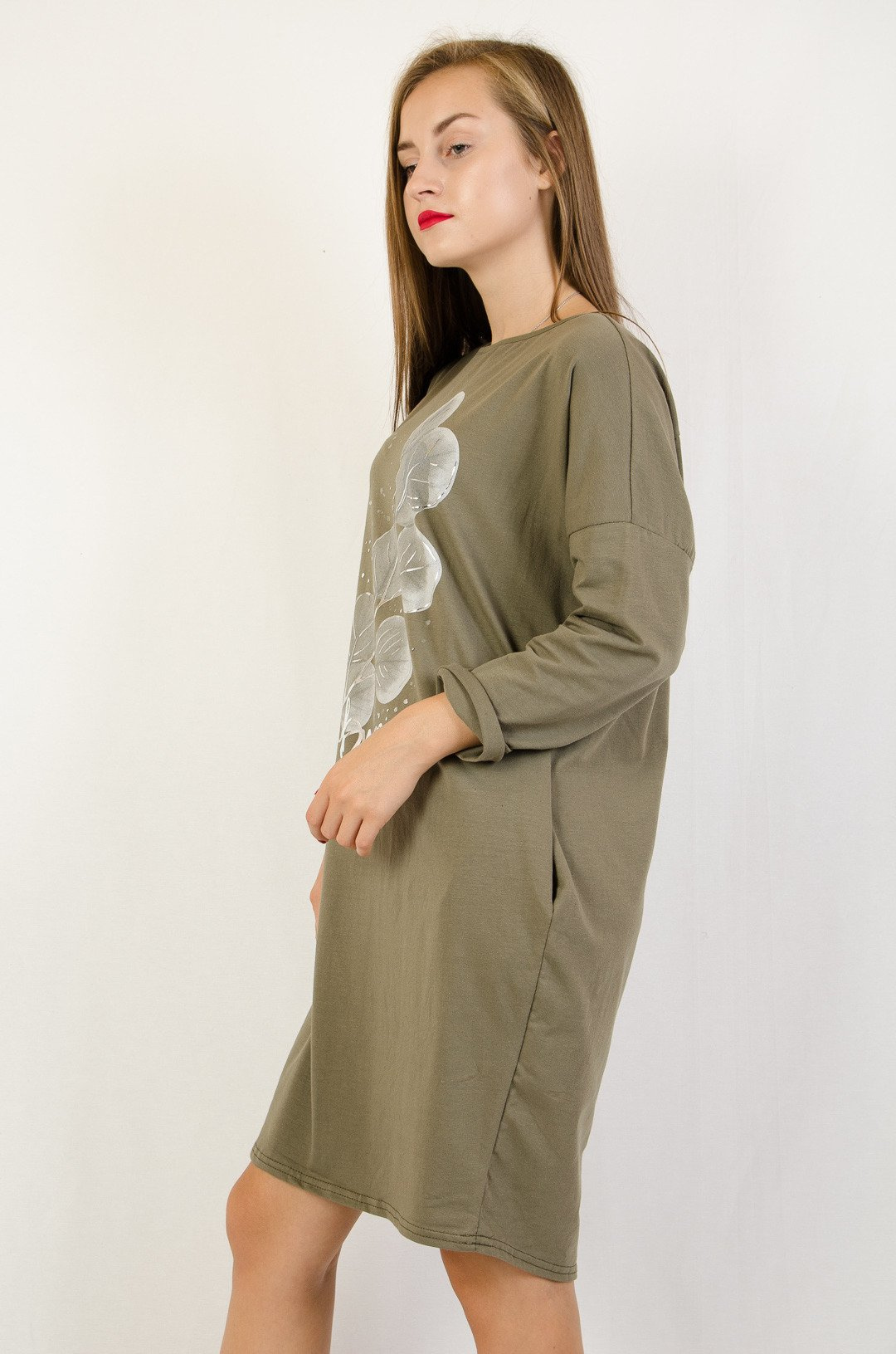 Zielona sukienka z kieszeniami oraz kwiatem z przodu.