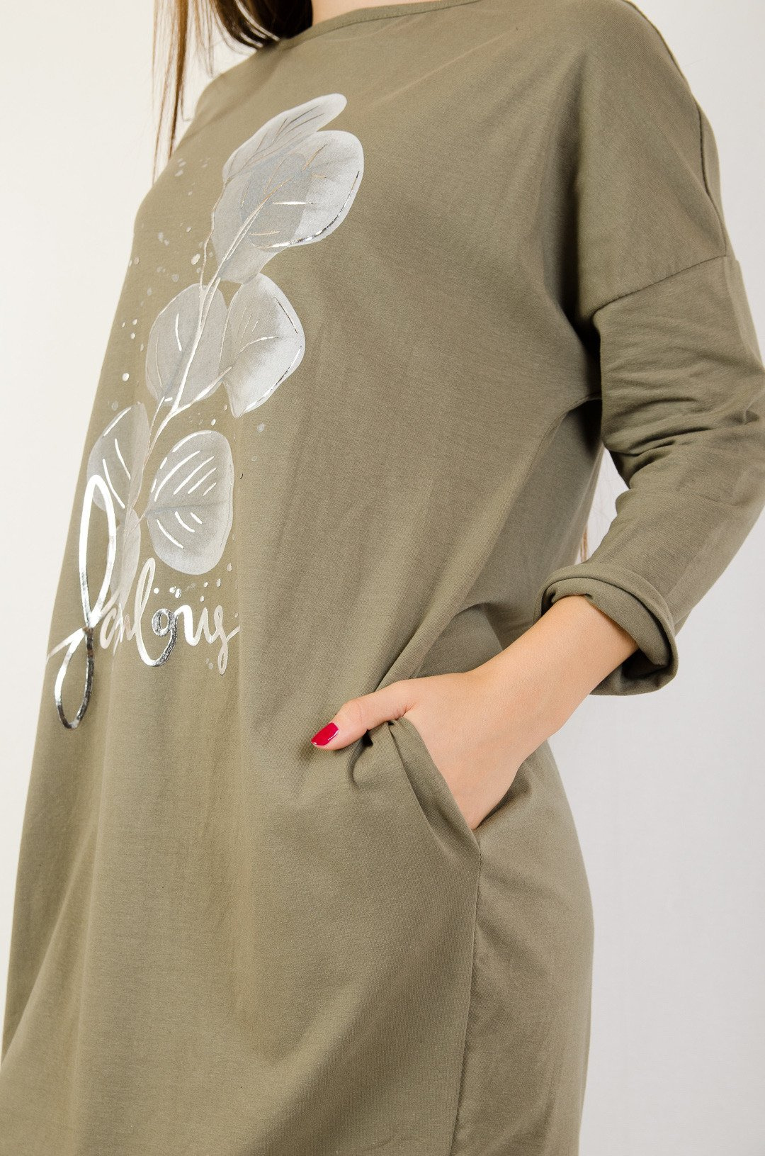 Zielona sukienka z kieszeniami oraz kwiatem z przodu