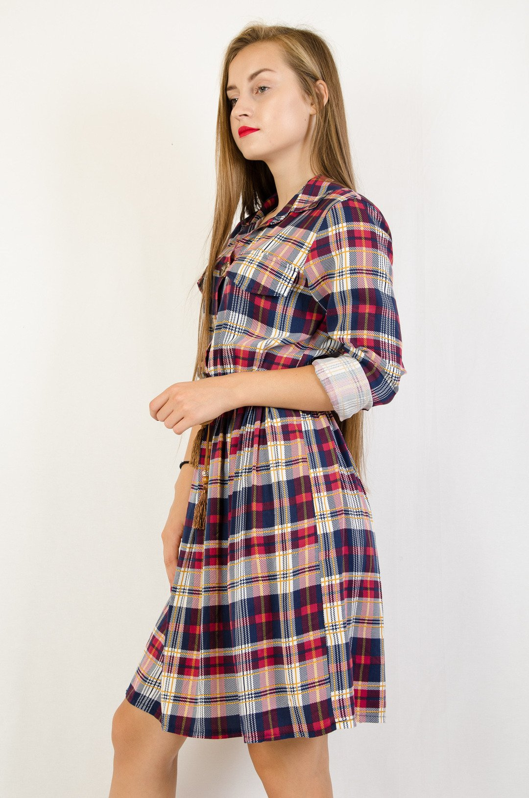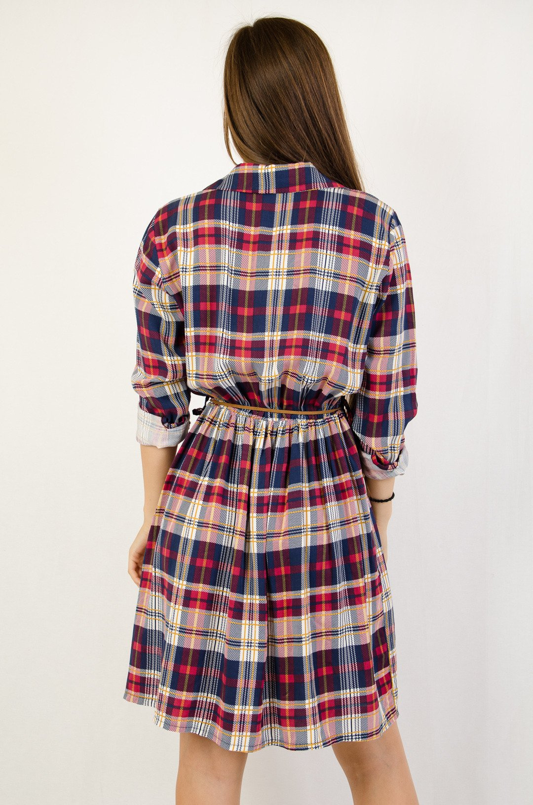 Koszulowa sukienka w kratę z gumką w pasie, zapinana na guziki.