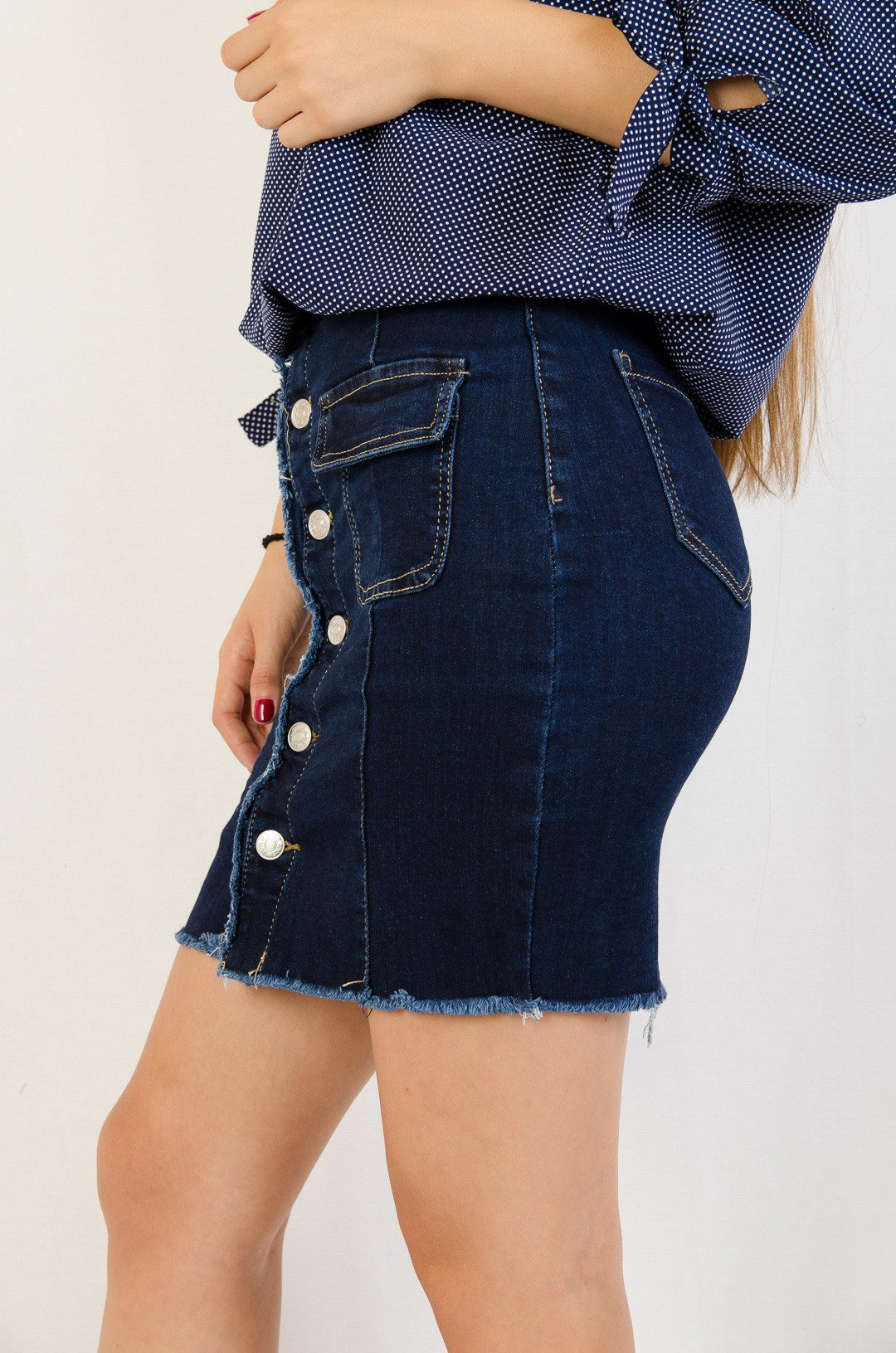 Granatowa spódniczka jeansowa zapinana na guziki oraz kieszeniami z przodu i z tyłu.