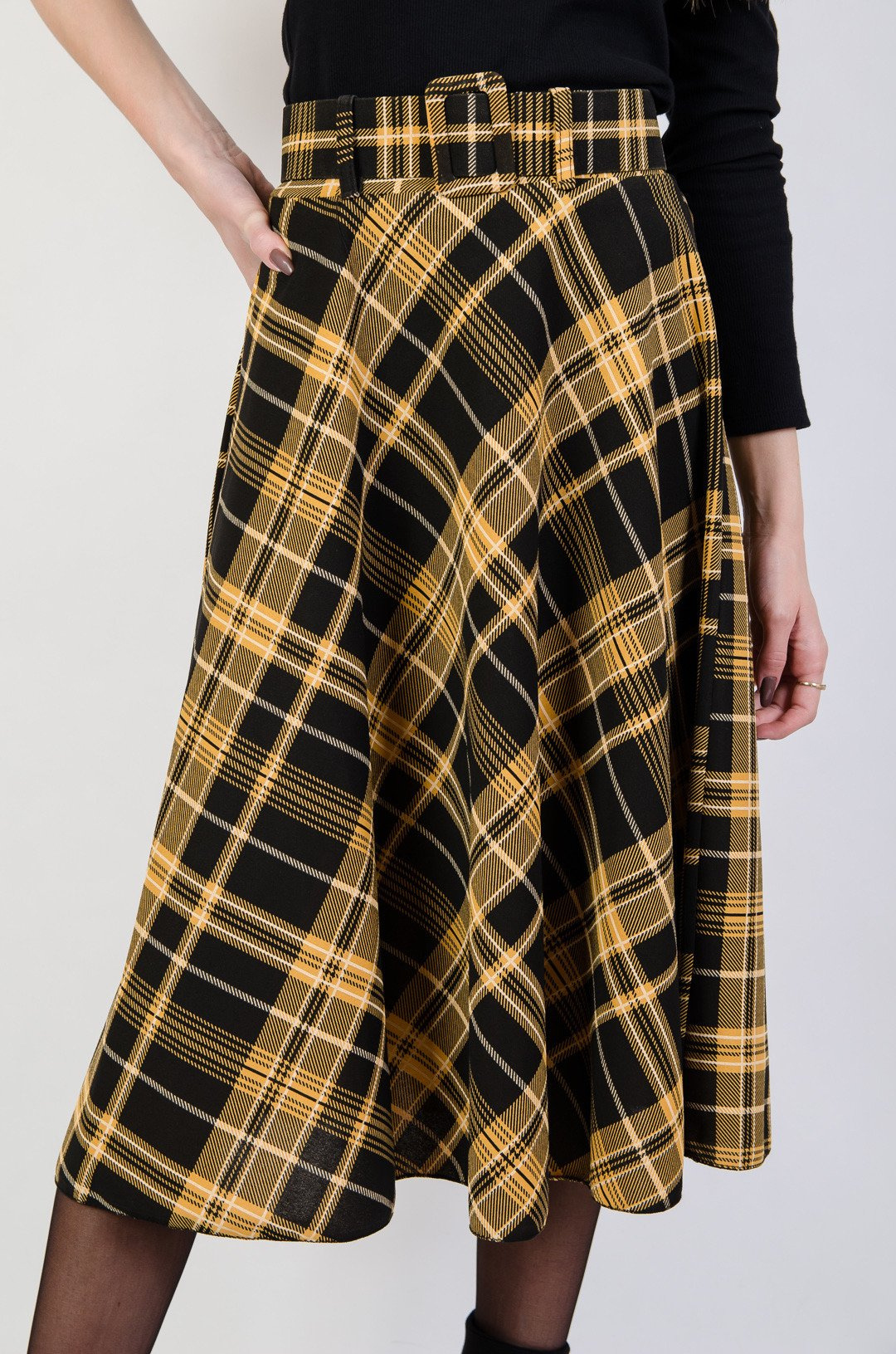 Żółta rozkloszowana spódnica w kratę z paskiem