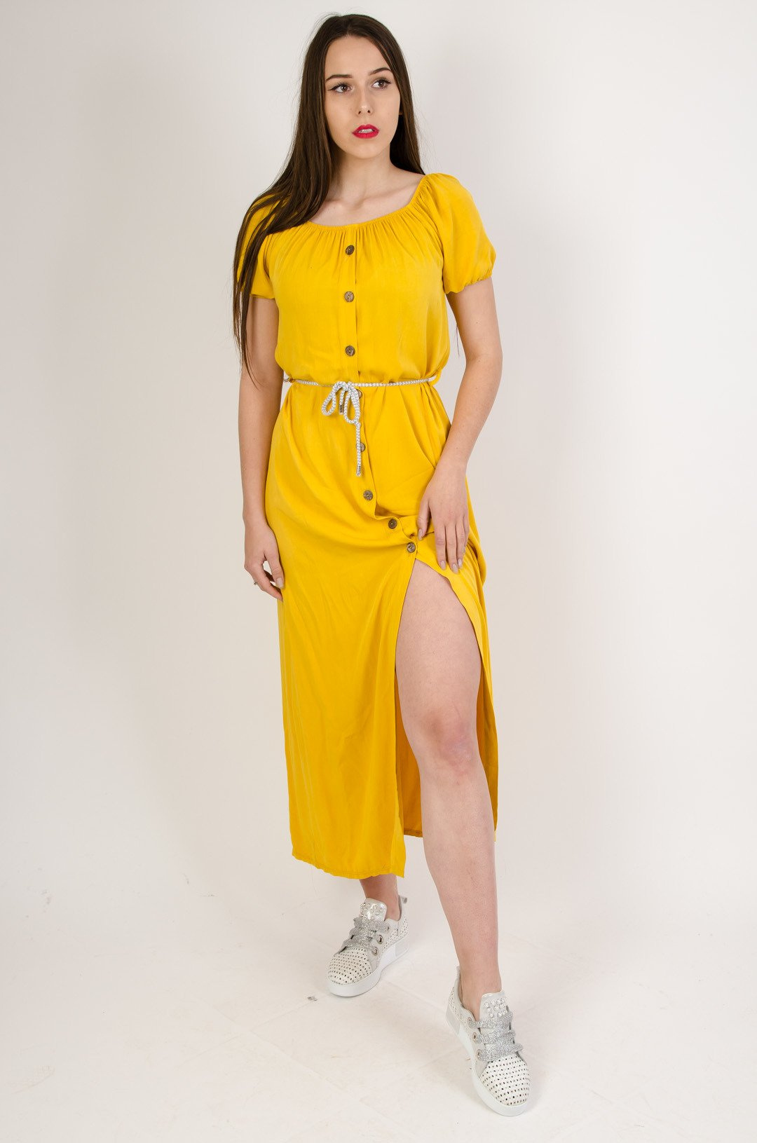Żółta sukienka zapinana na guziki, wiązana w pasie