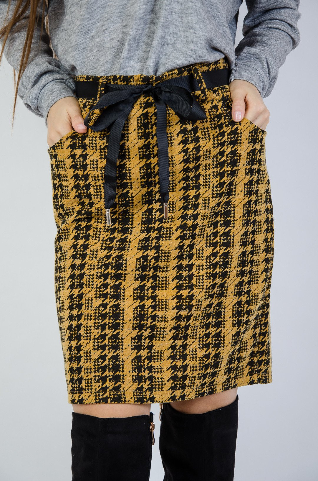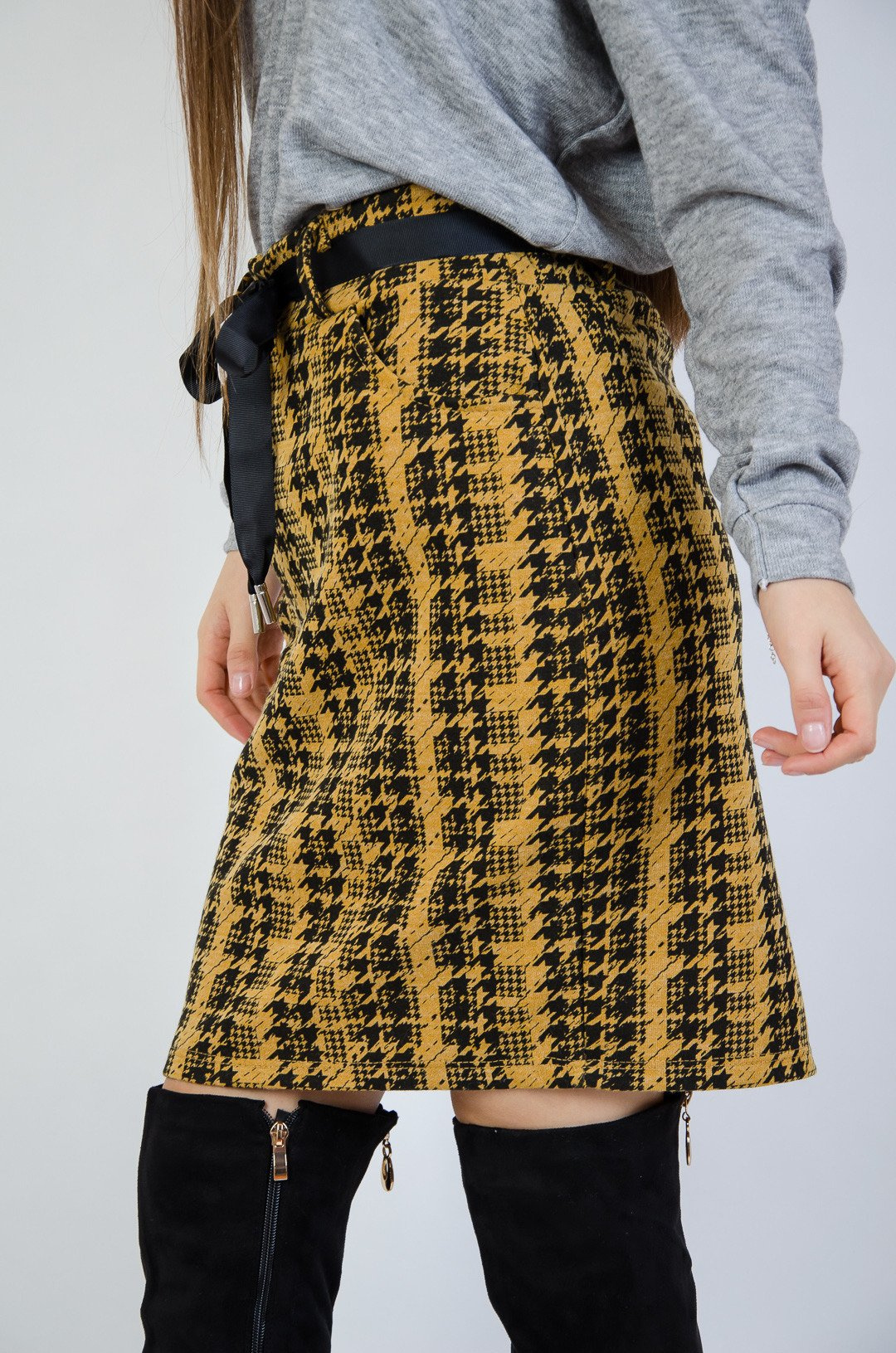 Musztardowa spódnica w pepitkę wiązana wstążką w pasie