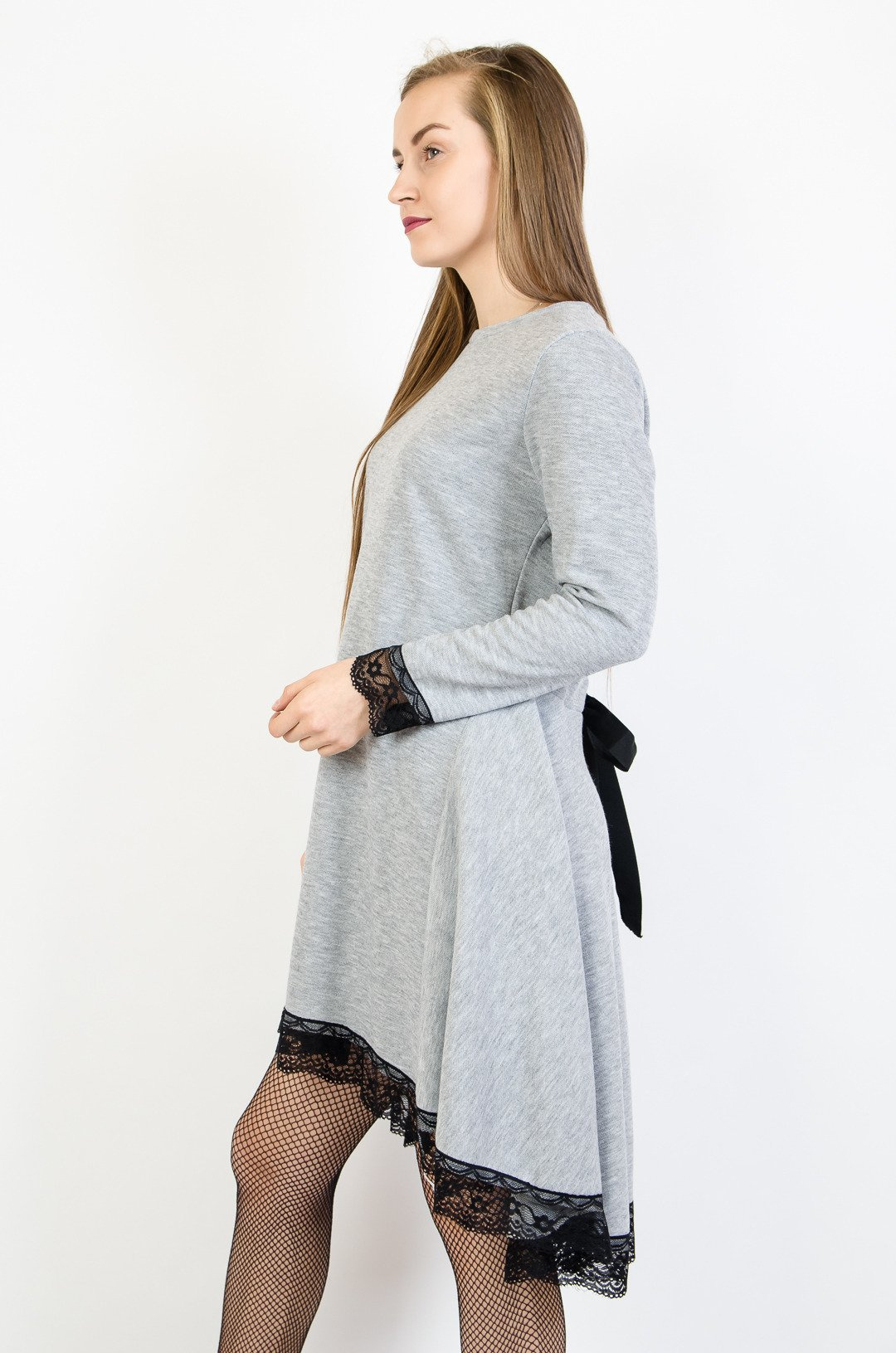 Szara sukienka z przedłużanym tyłem zakończona koronką.
