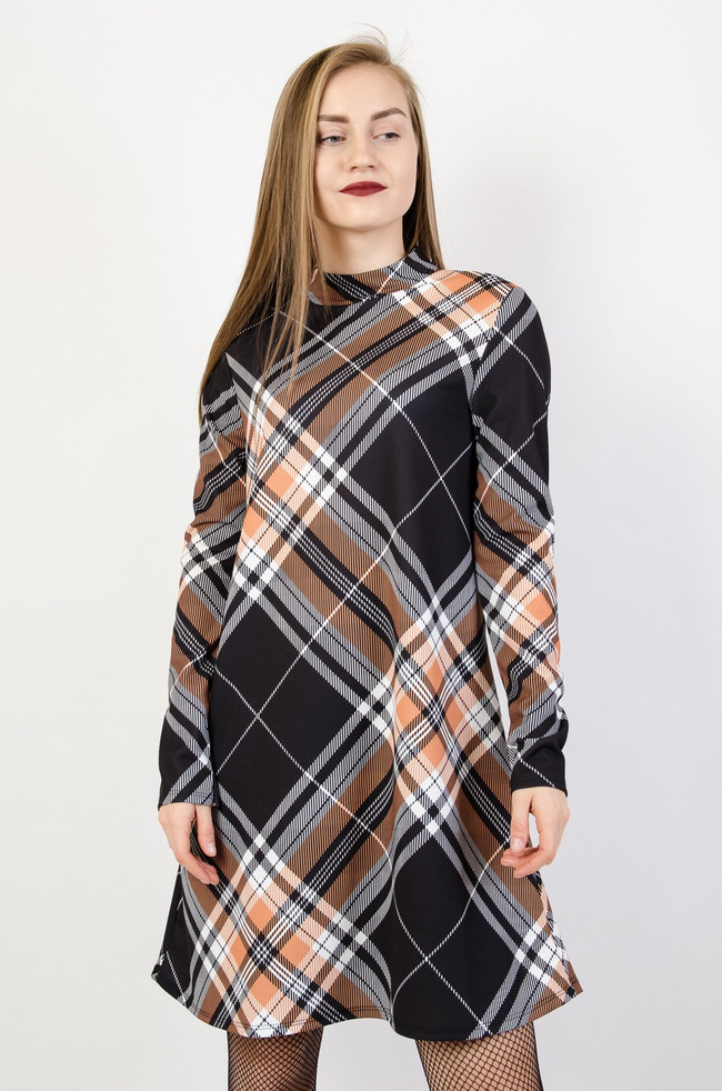 Prosta sukienka w czarno-brązową kratę z długim rękawem.
