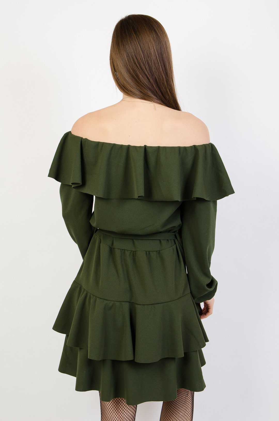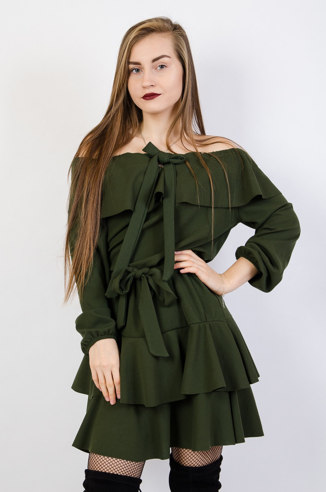 Zielona rozkloszowana sukienka z hiszpańskim dekoltem