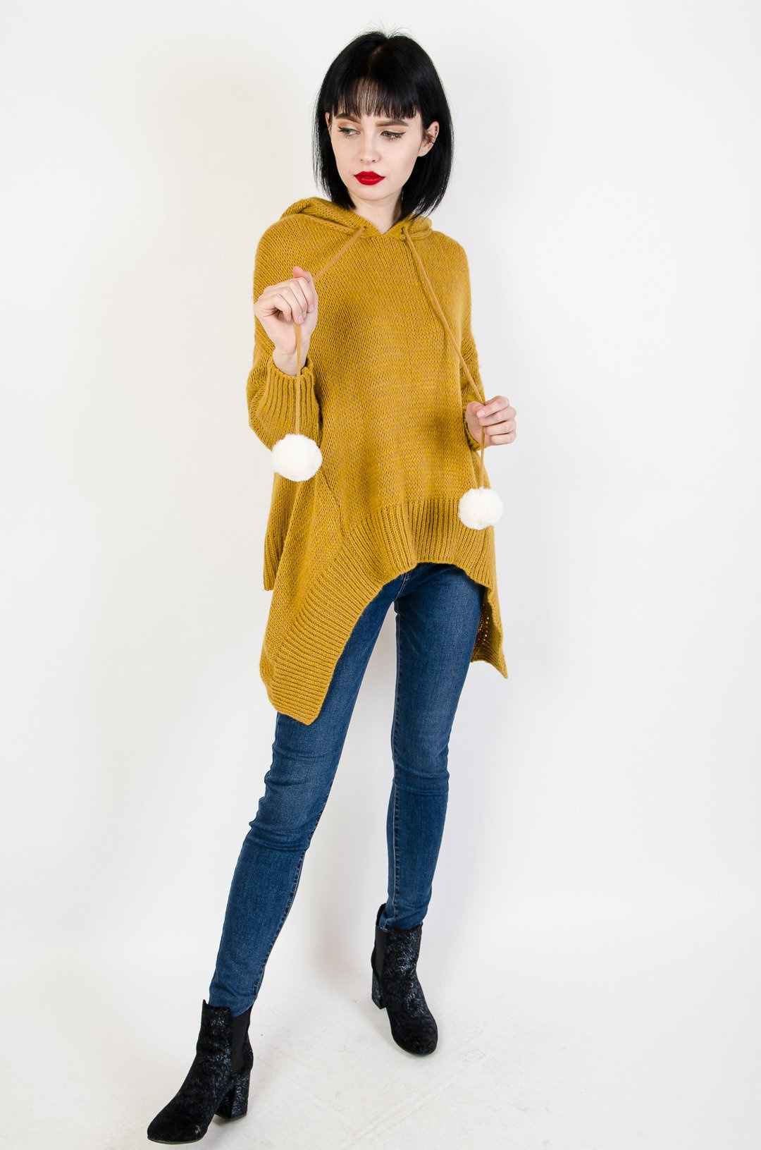 Musztardowy sweter z dłuższymi bokami oraz kapturem.