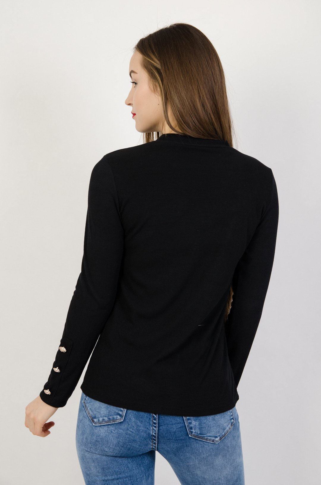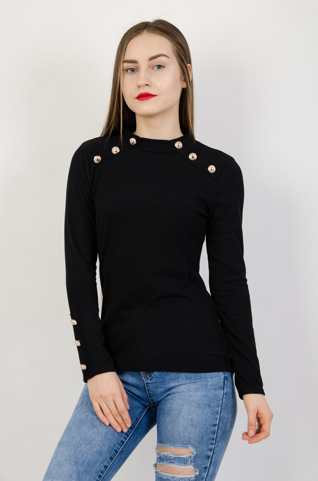 Czarna prążkowana bluzka ze złotymi guzikami