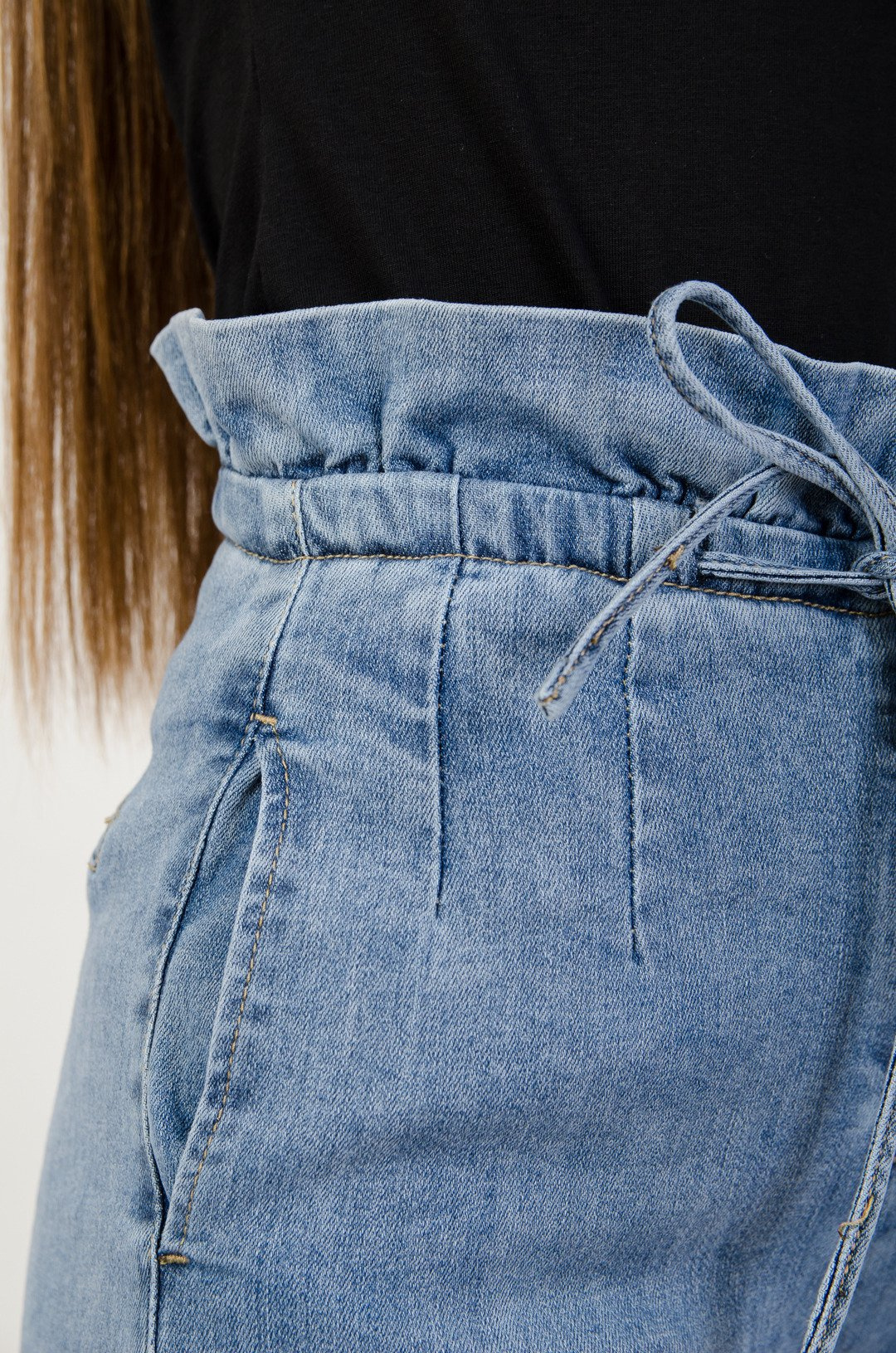 Jasne spodnie jeansowe haremki z falbaną w pasie.