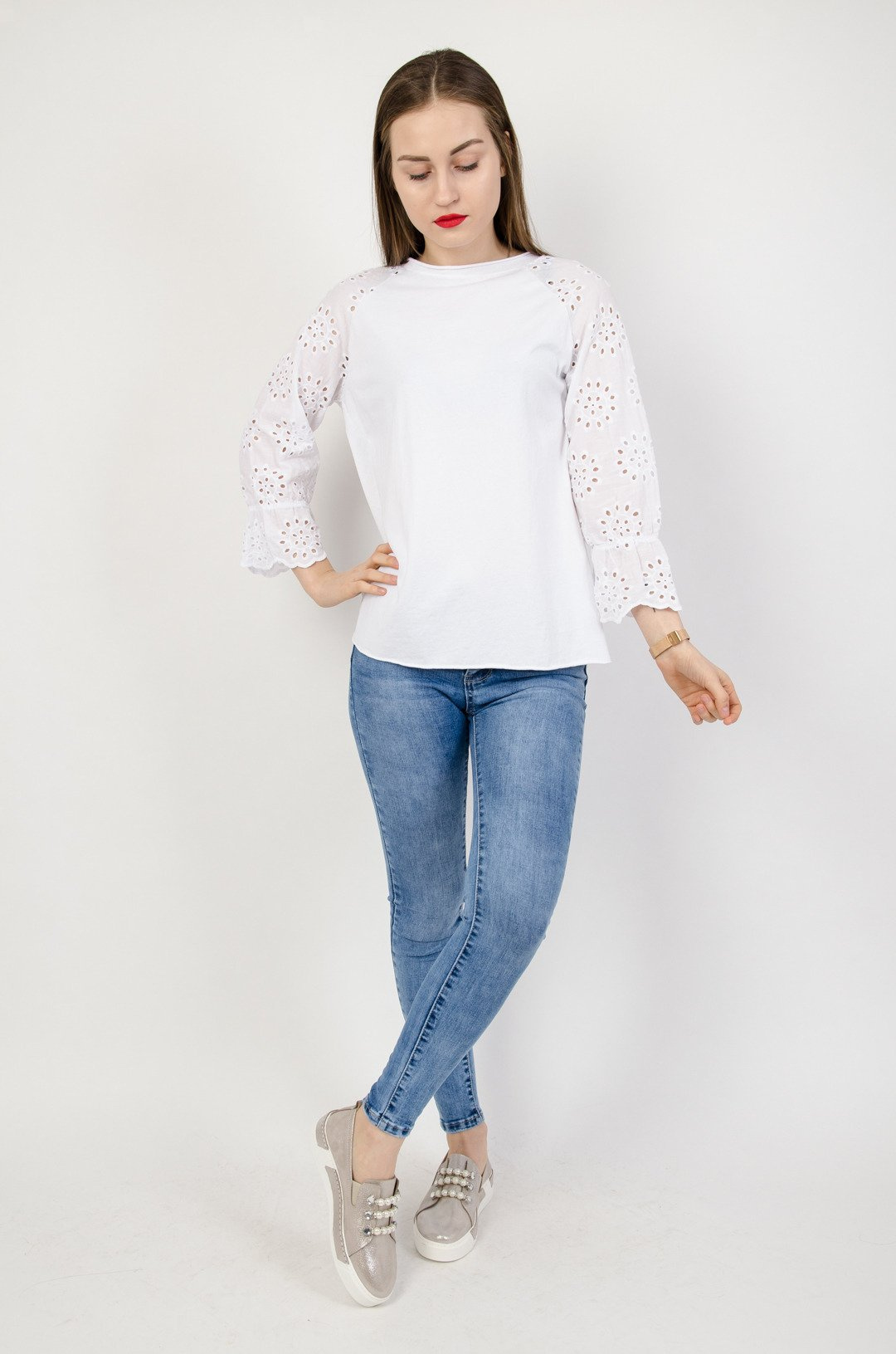 Biała bluzka z ażurowymi rękawami.