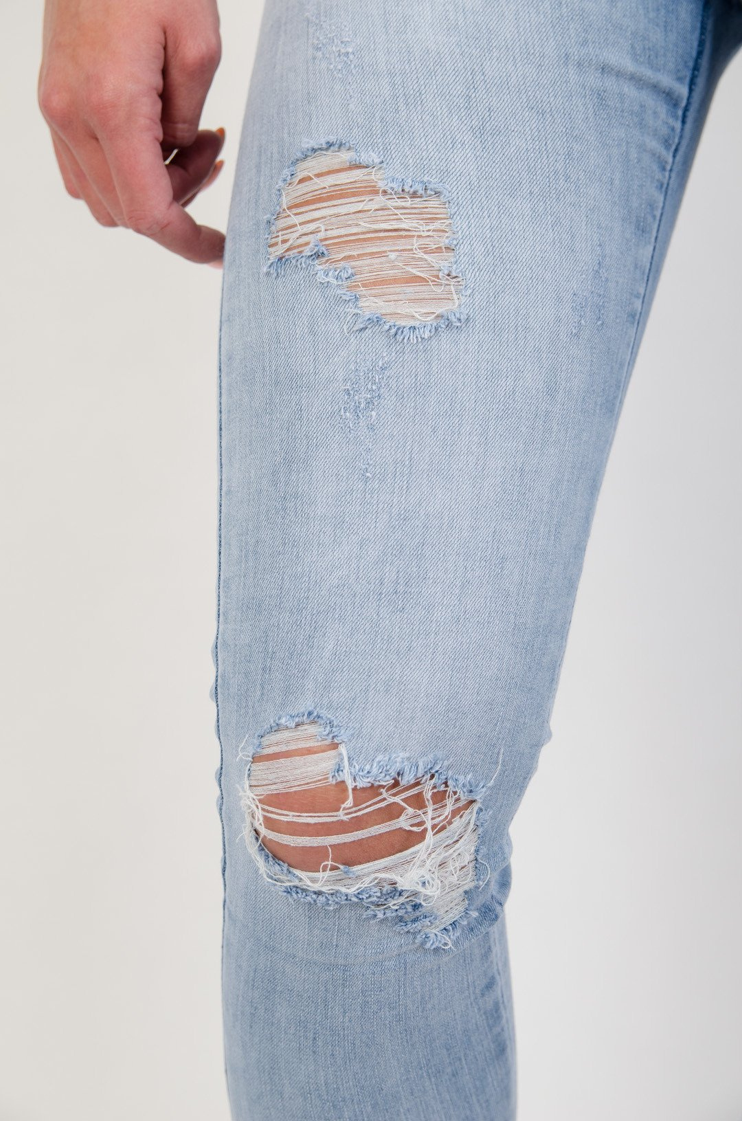 Jasne spodnie jeansowe z dziurami i zamkiem na nogawce