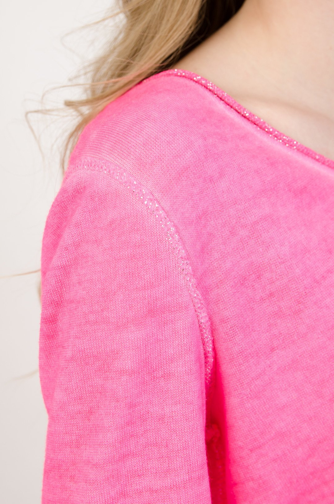 Różowa neonowa bluzka wyszywana srebrną nicią