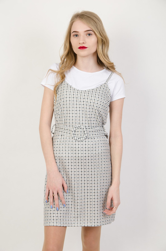 Sukienka w drobną kratkę z białą bluzką w zestawie