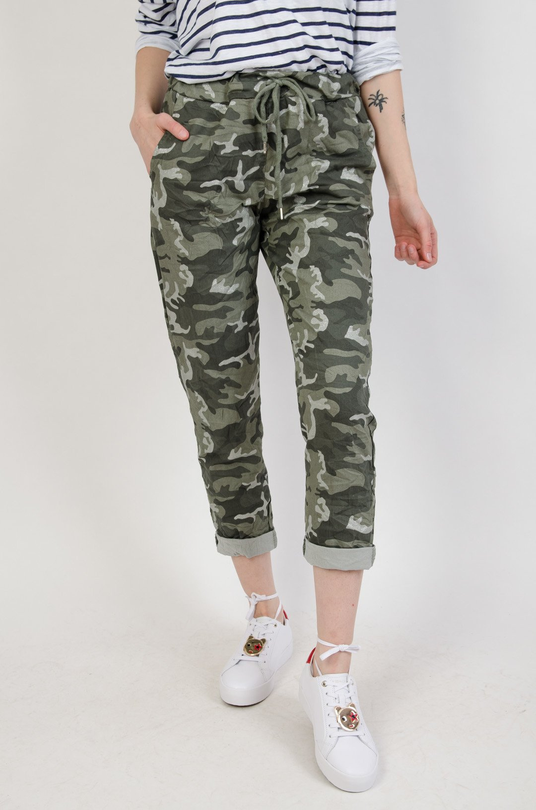 Zielono-srebrne spodnie moro z połyskującymi elementami