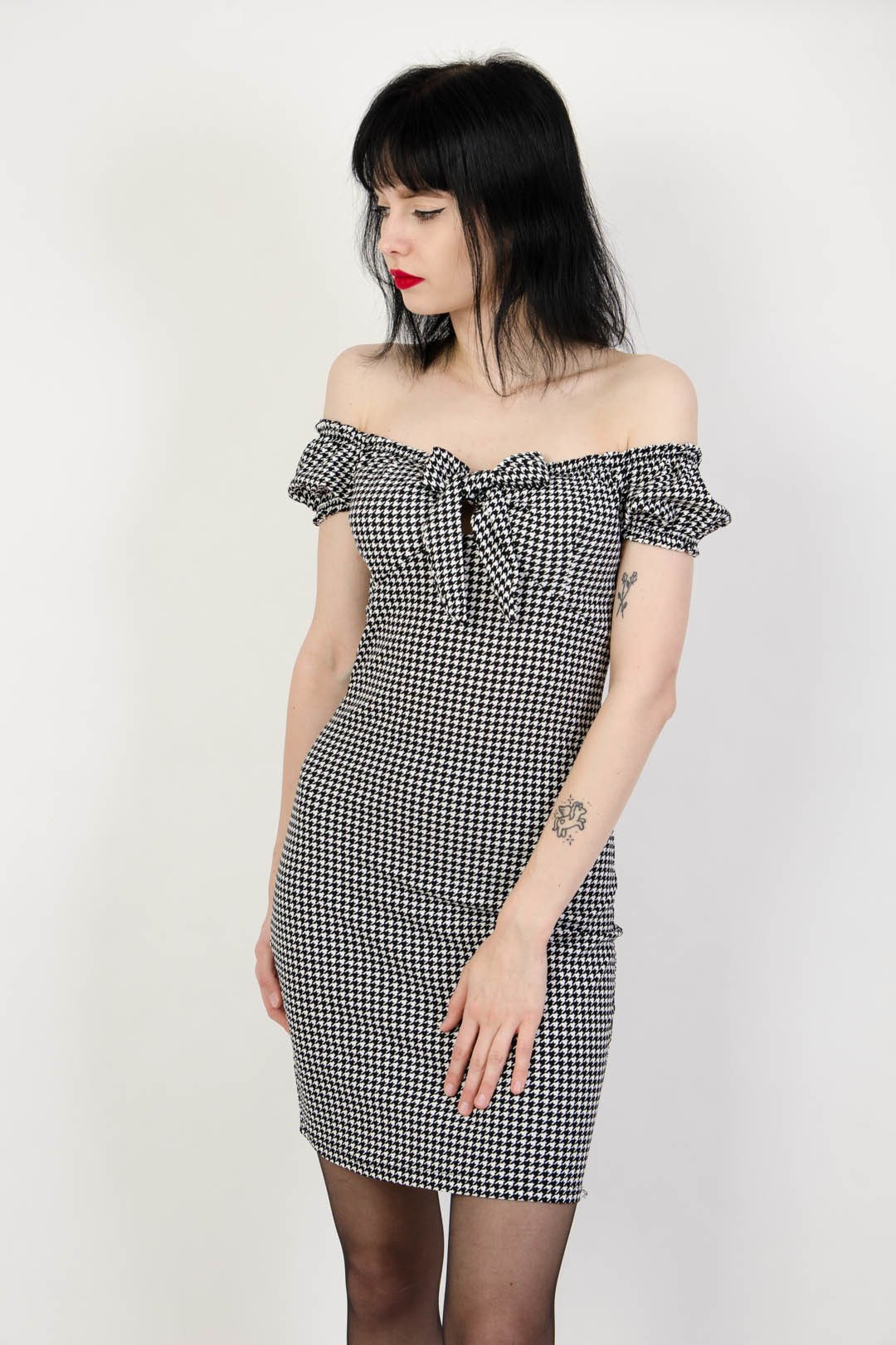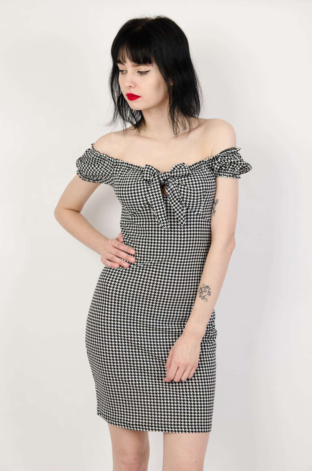 Dopasowana sukienka w pepitkę z odkrytymi ramionami.