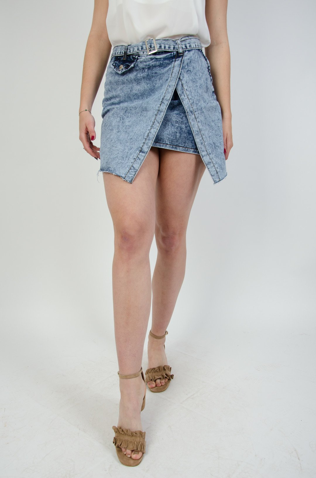 Jeansowa spódnica z rozcięciem na boku oraz paskiem.