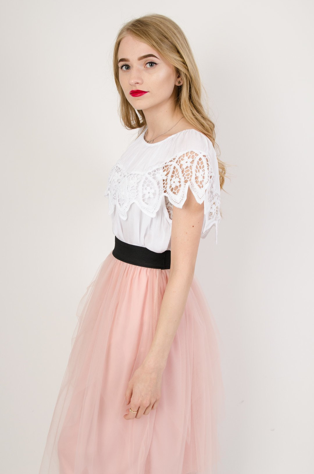 Biała bluzka z hiszpańskim dekoltem i ażurowym wykończeniem
