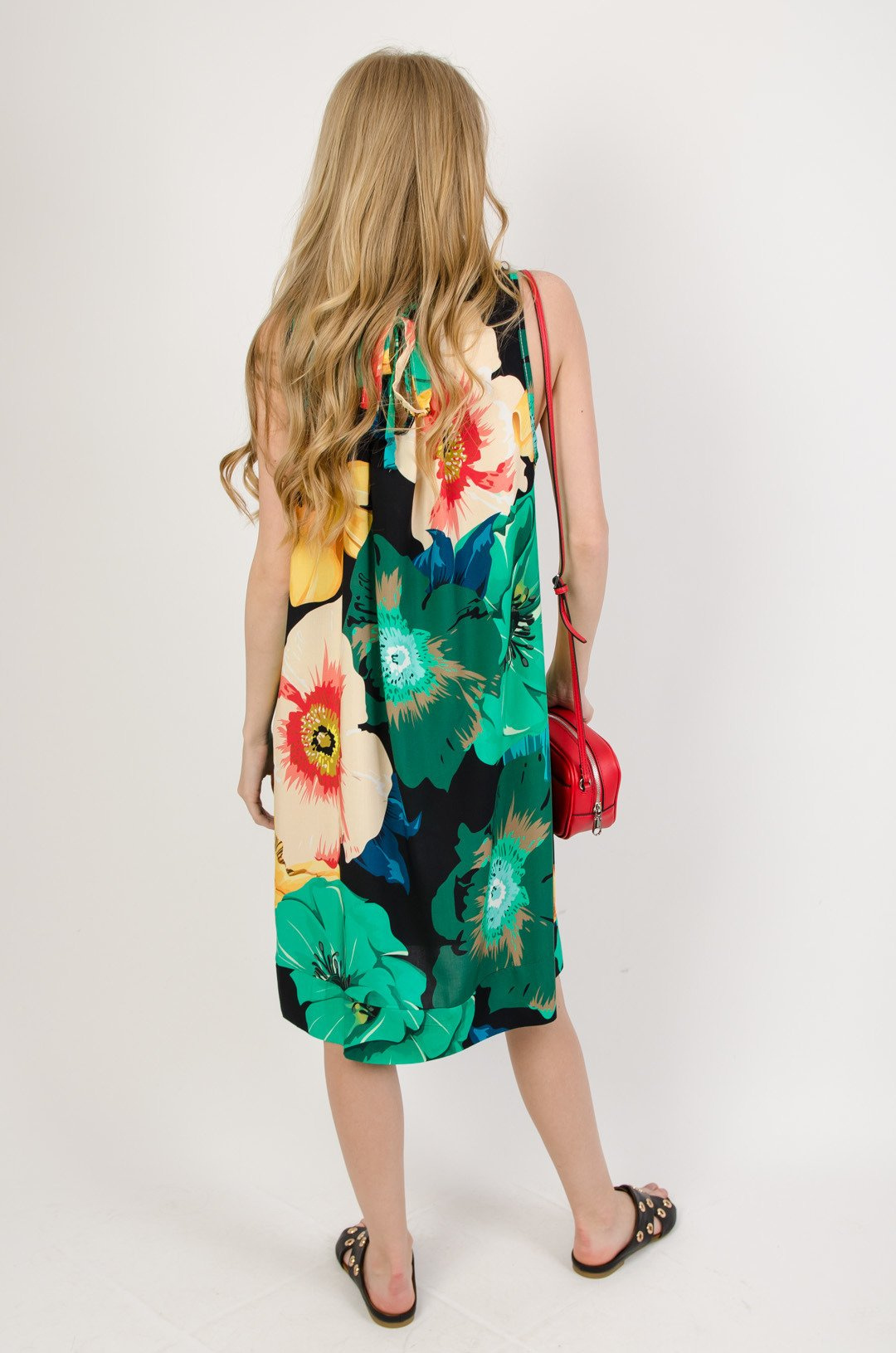 Zielona sukienka w kwiaty wiązana przy szyi