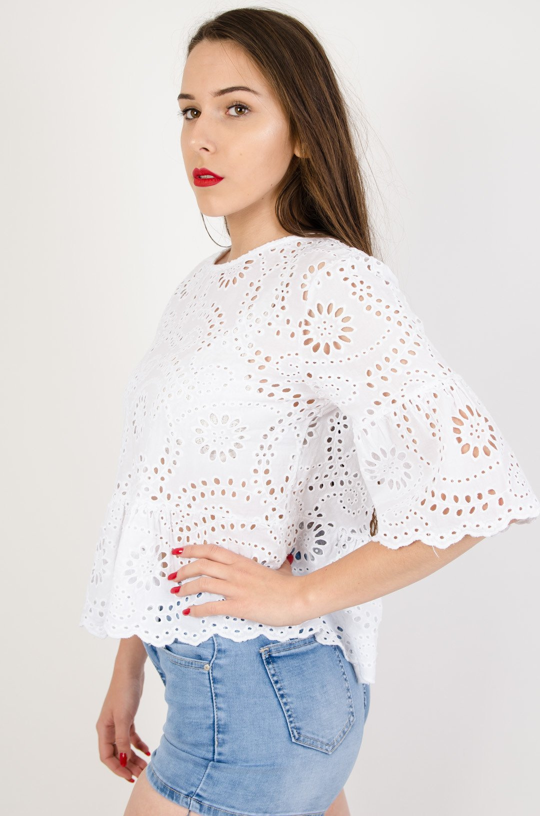 Biała ażurowa bluzka z rękawem 3/4