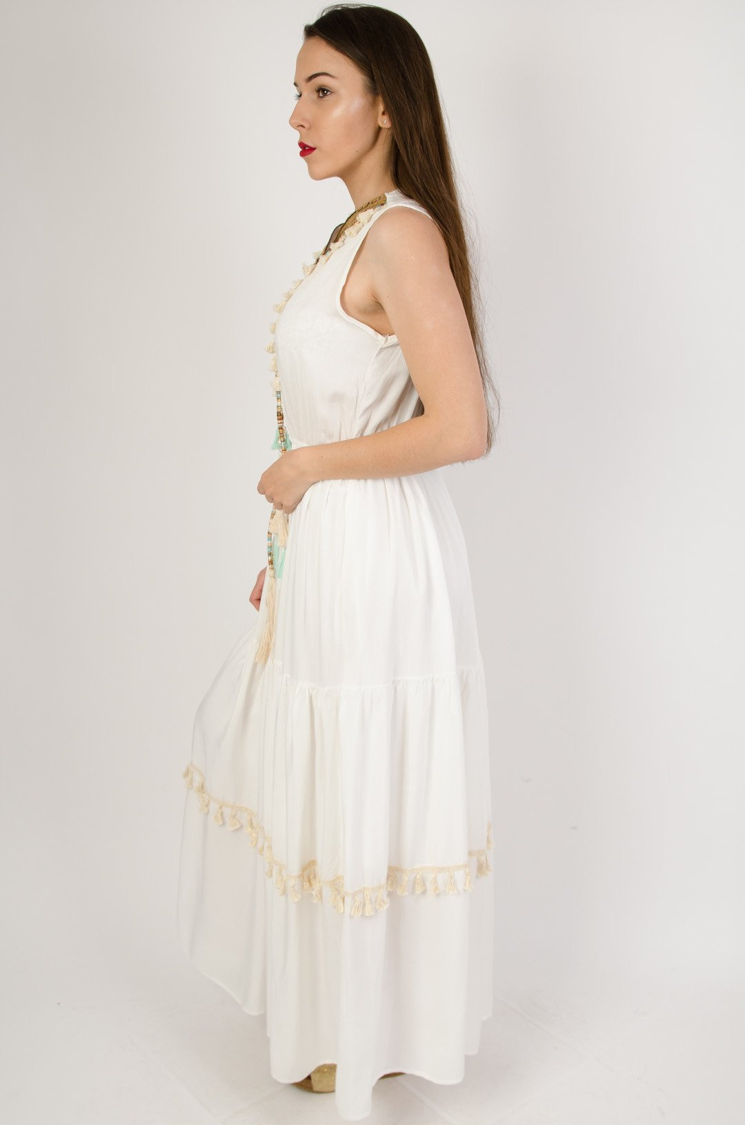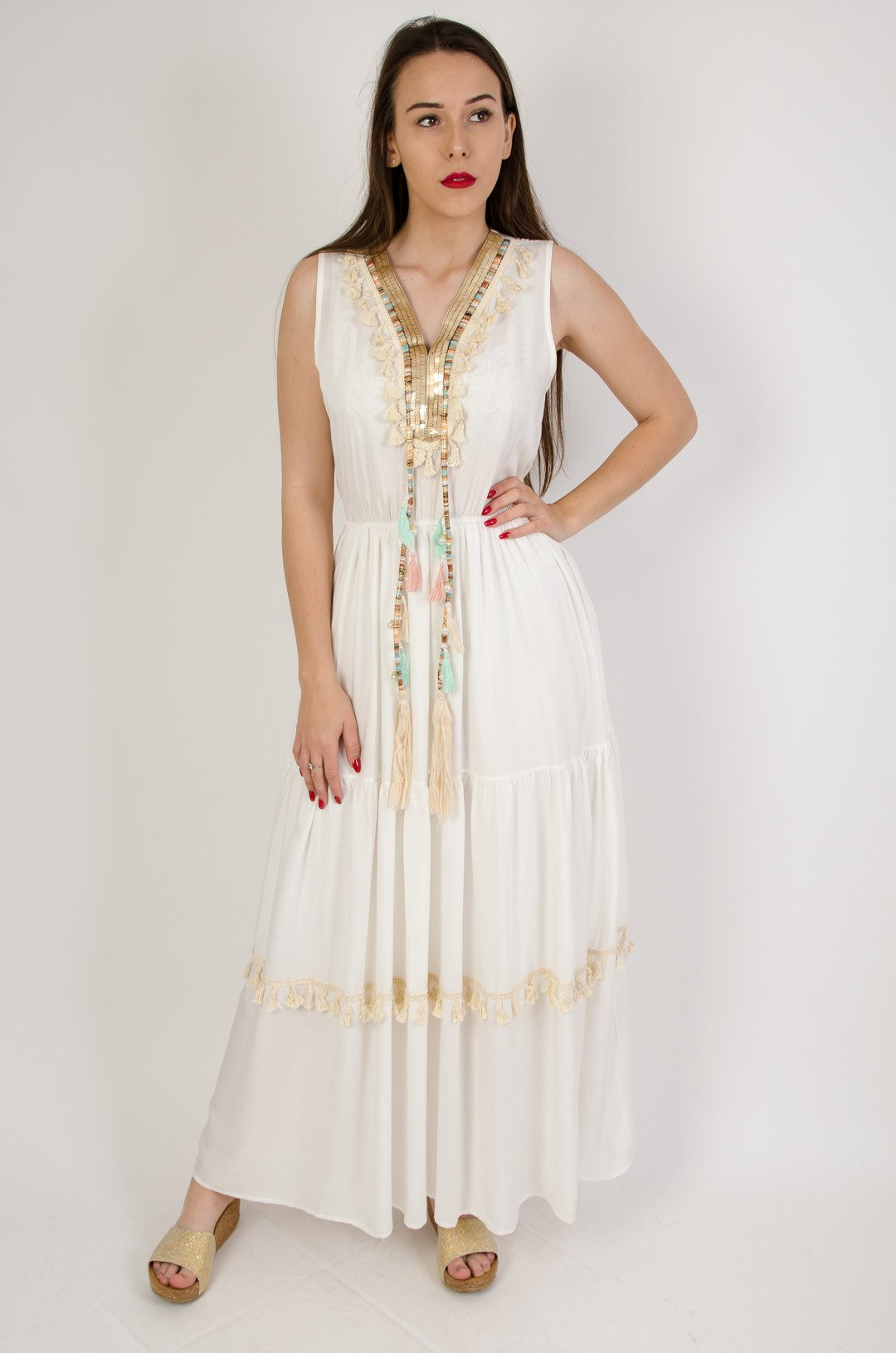 Długa sukienka ze złotymi cekinami obszyta pastelowymi frędzlami