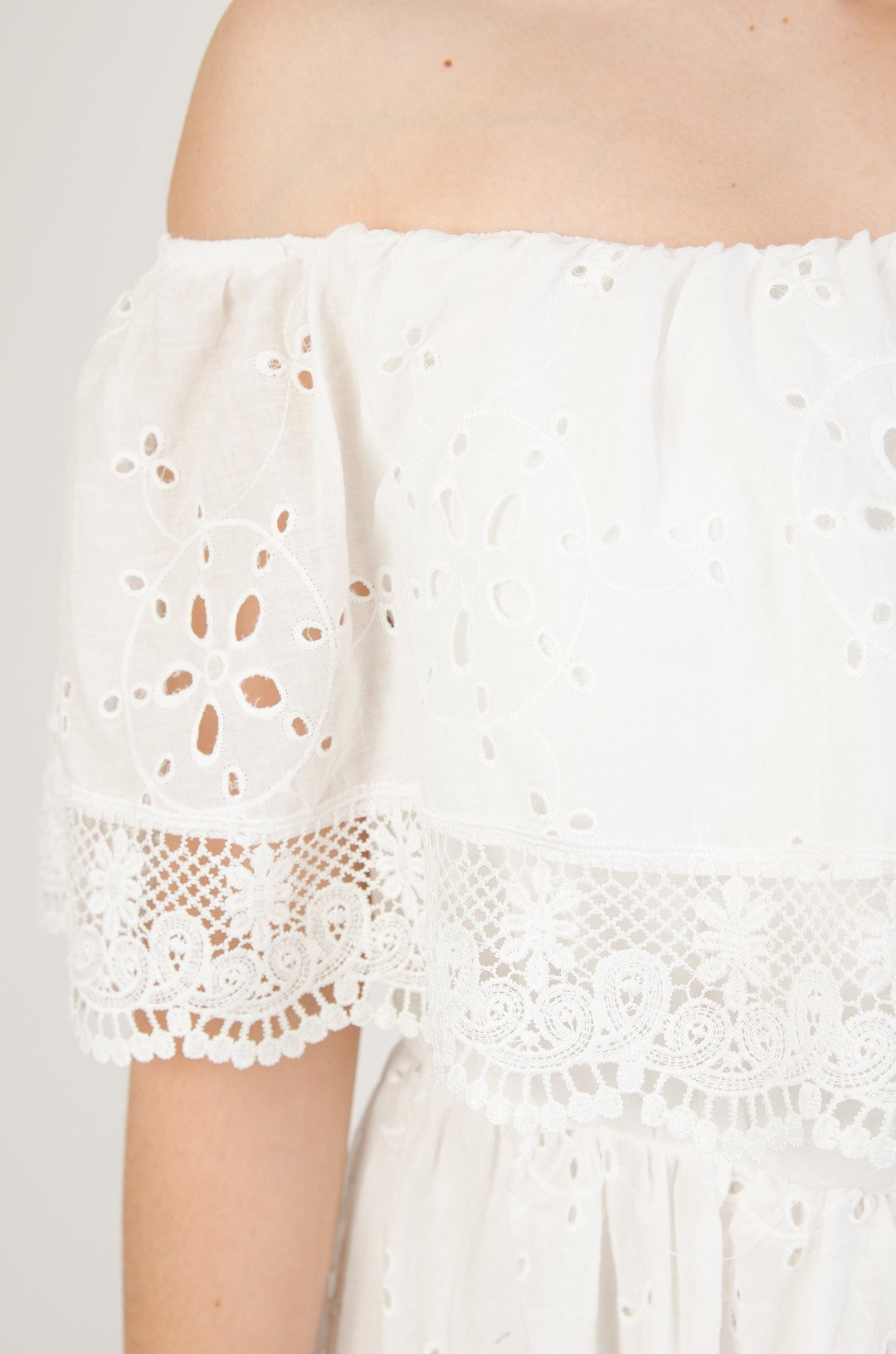 Biała długa ażurowa sukienka z hiszpańskim dekoltem zakończonym koronką
