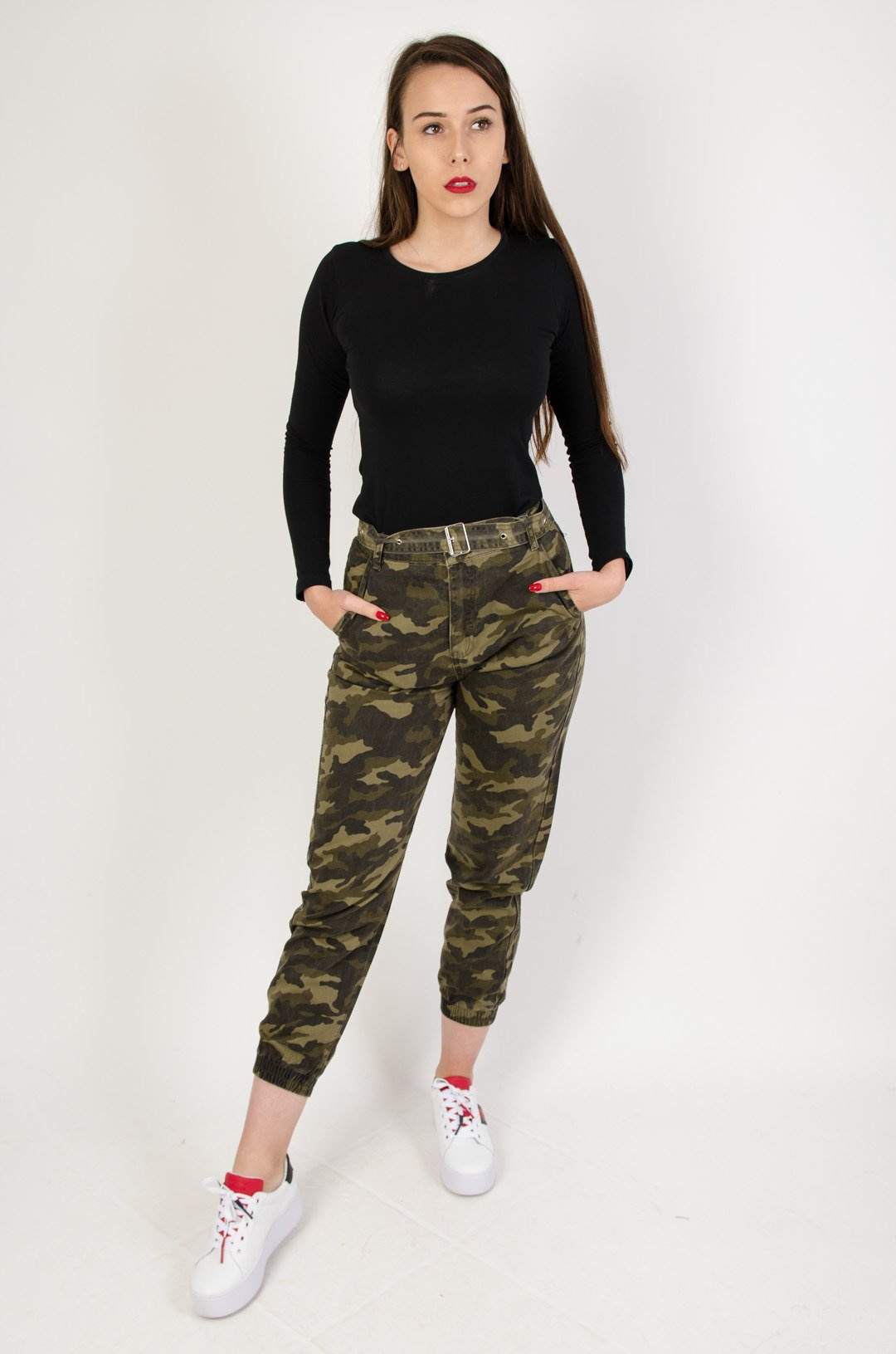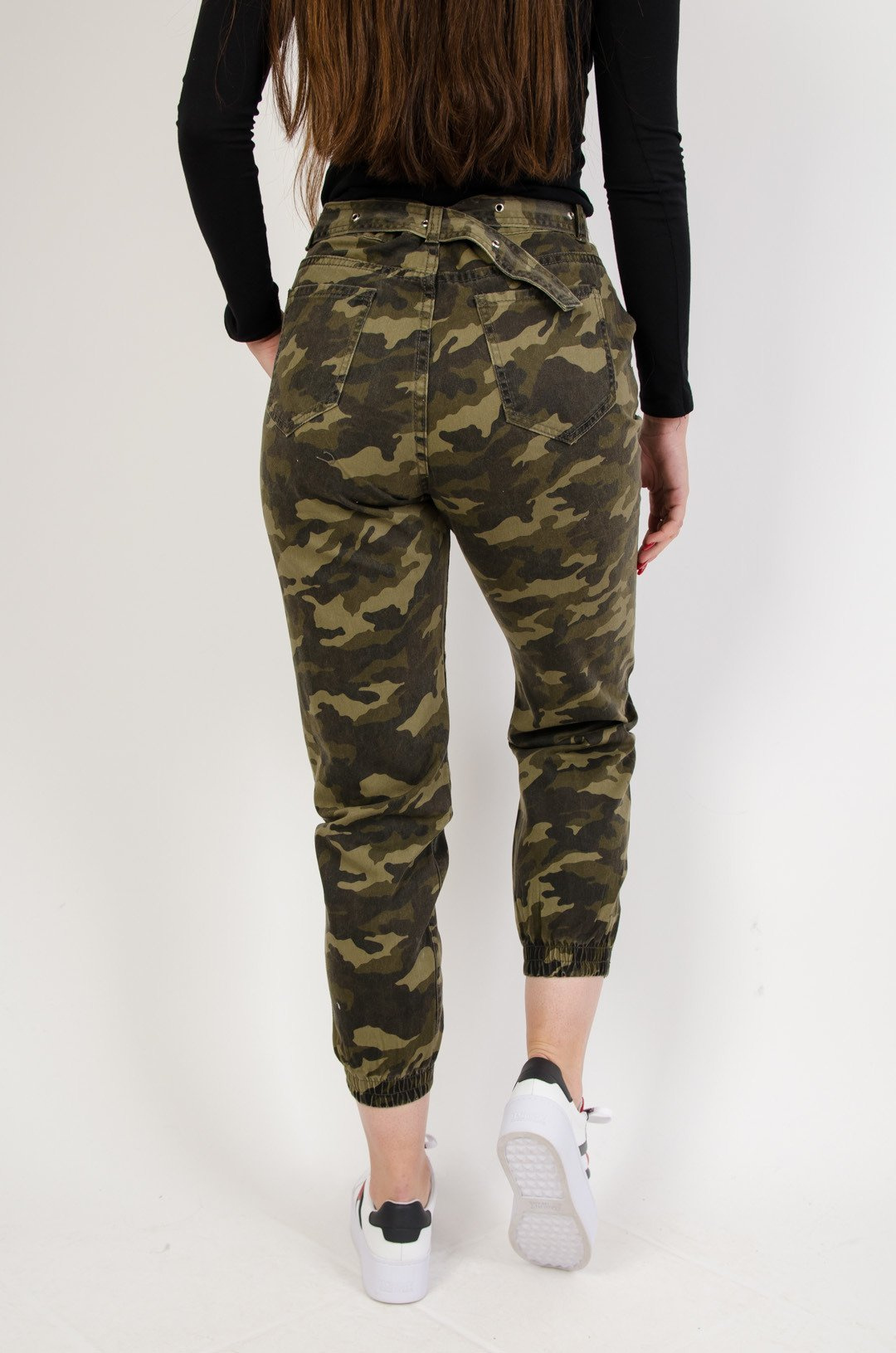 Spodnie moro z paskiem i ściągaczami na nogawce