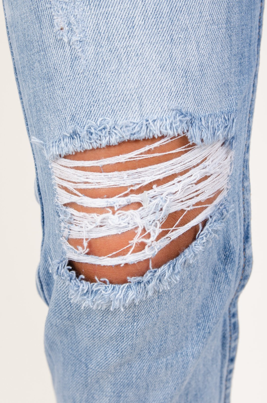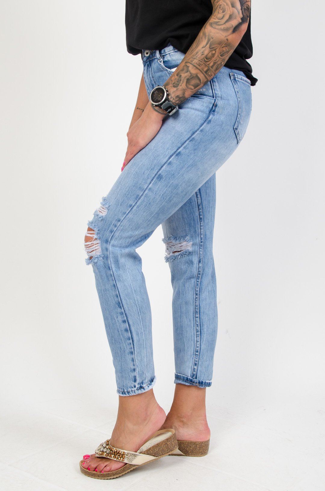 Jeansowe boyfriendy z dziurami i drobnym napisem pod kieszenią