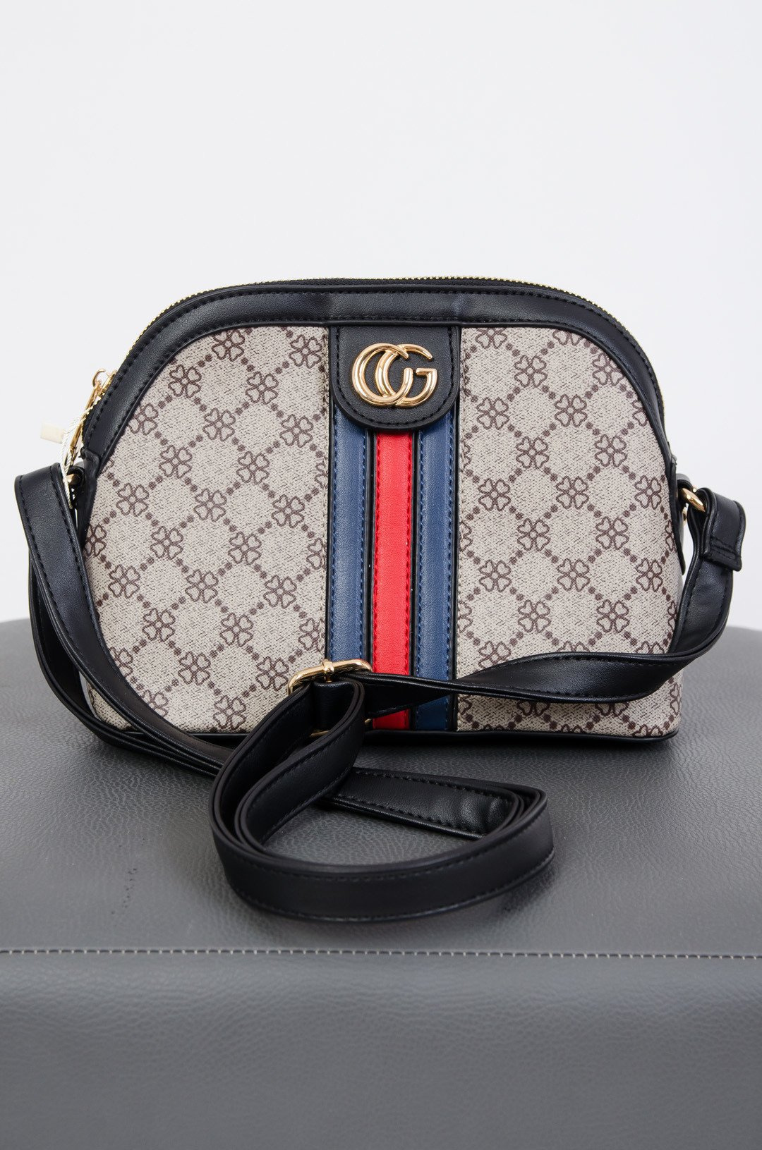 Wzorzysta torebka z czerwono-granatowym paskiem na przodzie