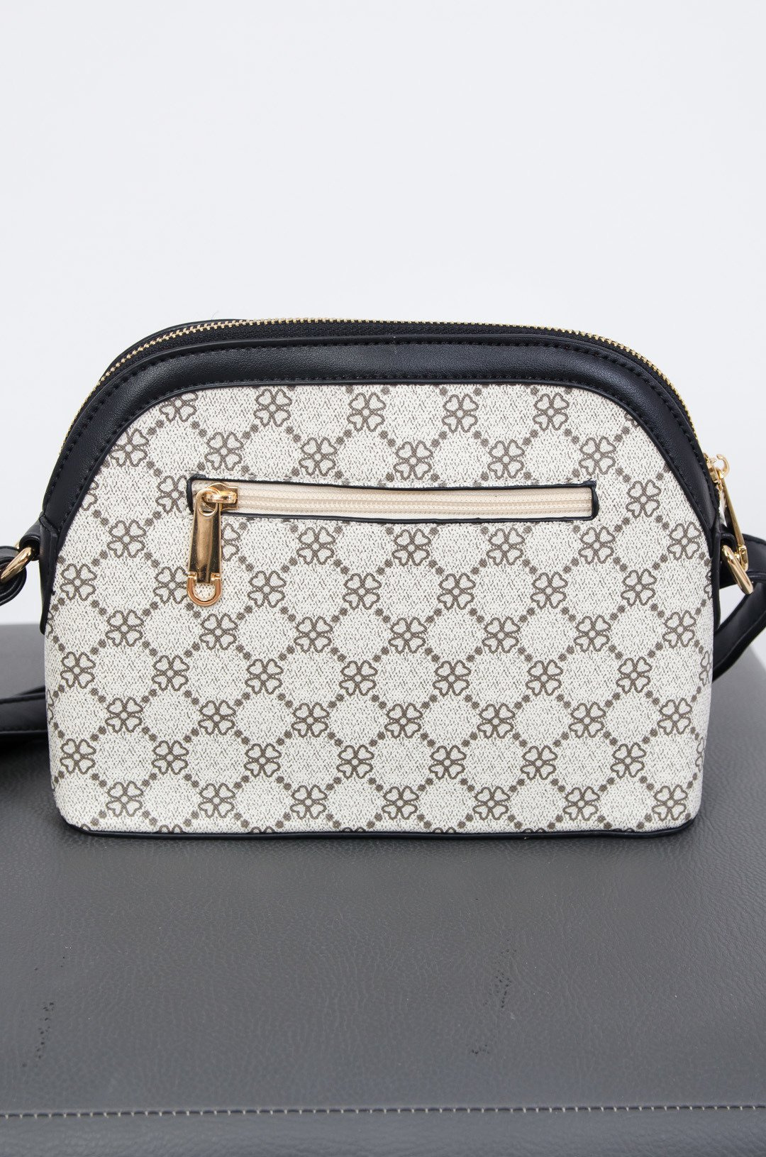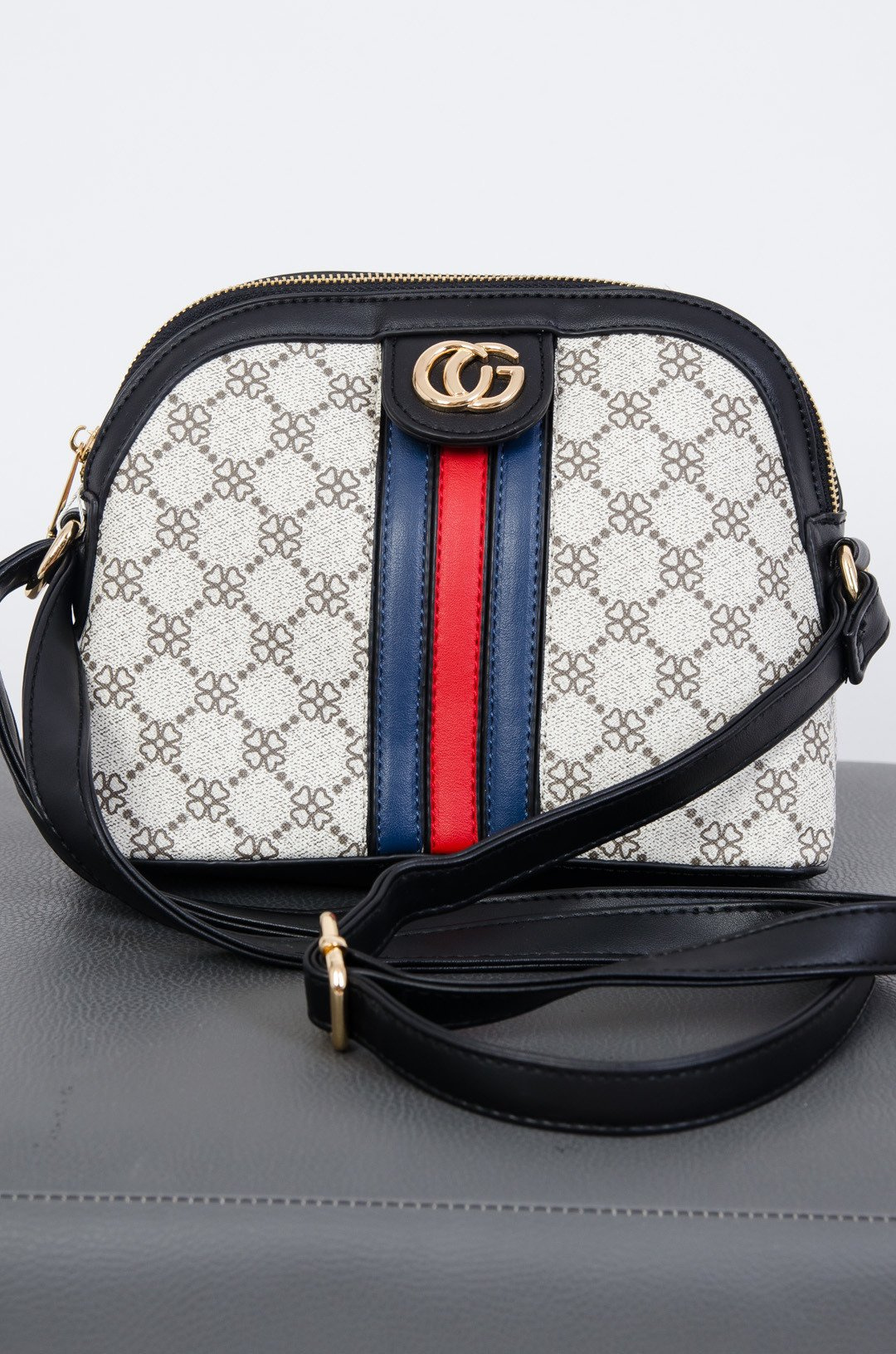 Wzorzysta torebka z czerwono-granatowym paskiem na przodzie