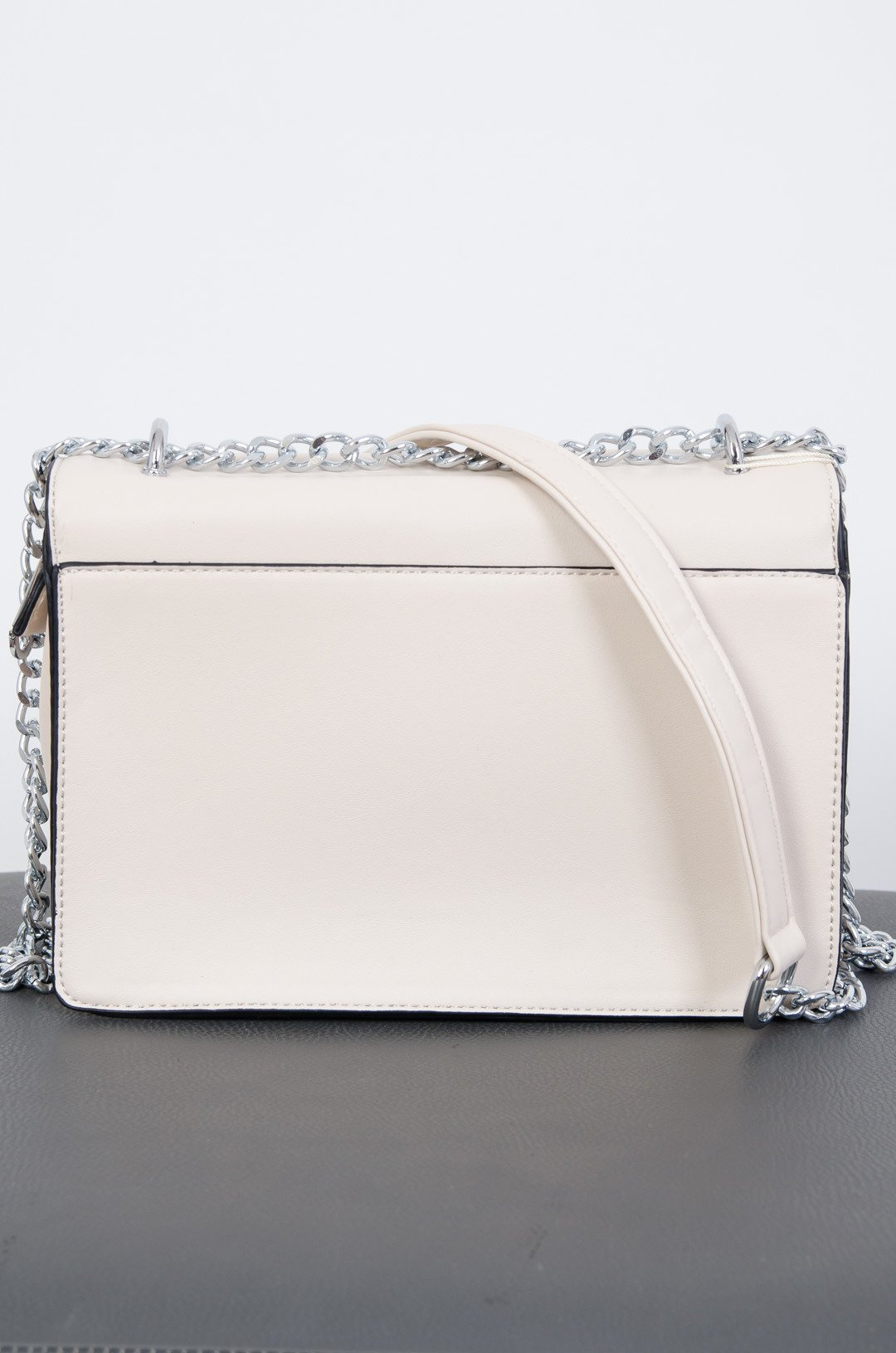 Kremowa torebka typu kuferek ze srebrnym łańcuszkiem