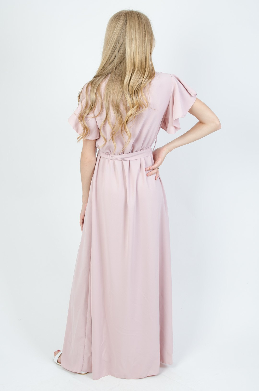 Jasno różowa długa sukienka z rozcięciem wiązana w pasie