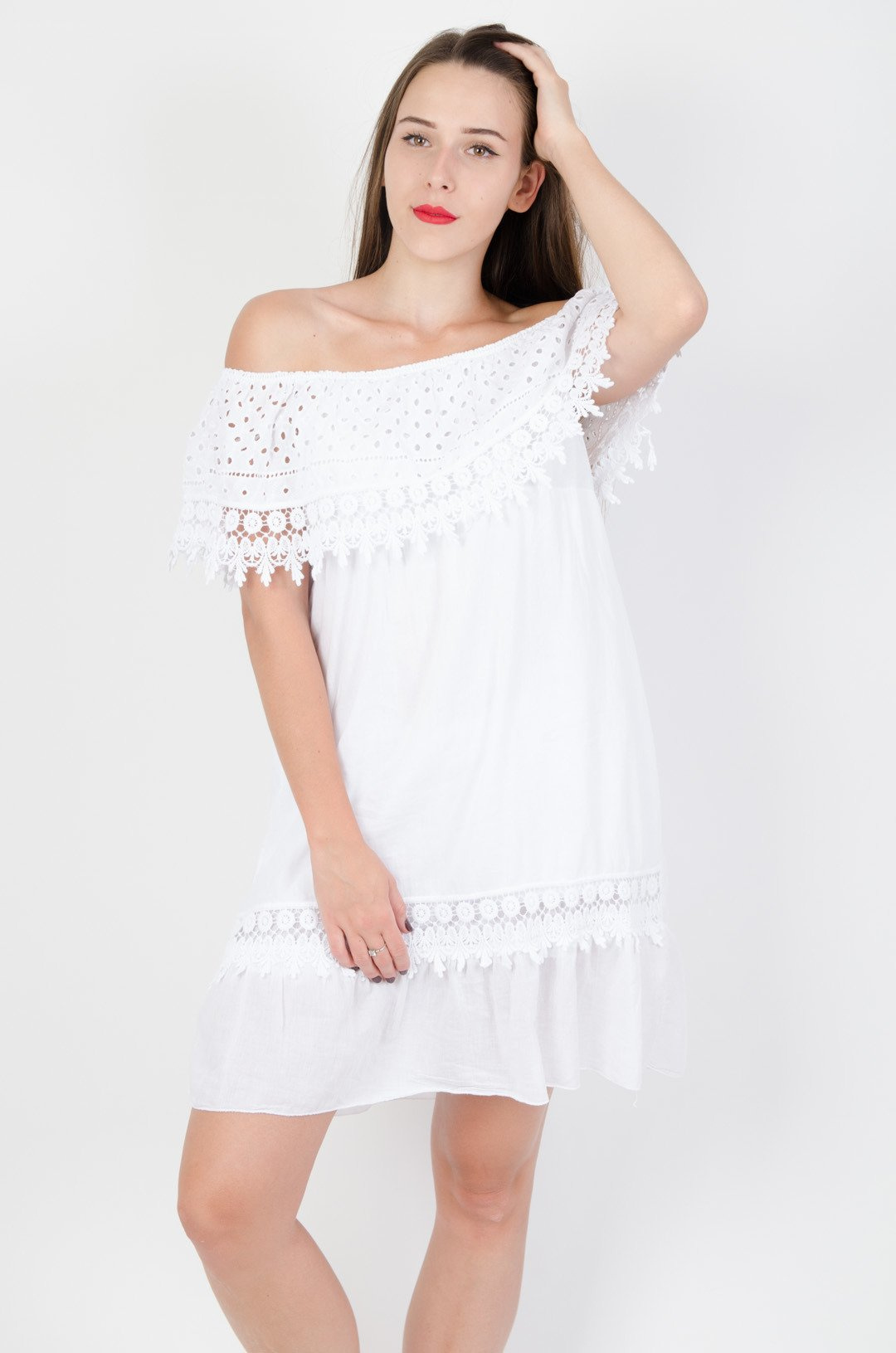 Biała sukienka hiszpanka z ażurowym dekoltem