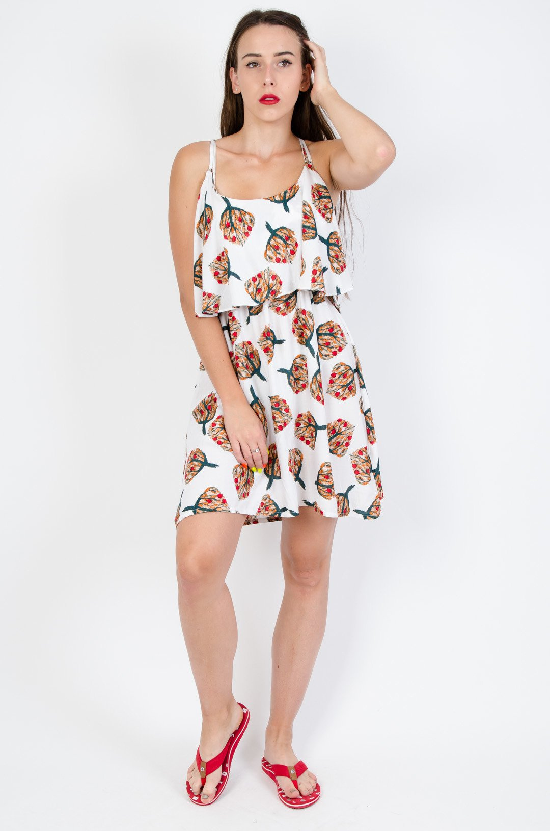 Biała wzorzysta sukienka z hiszpańskim dekoltem