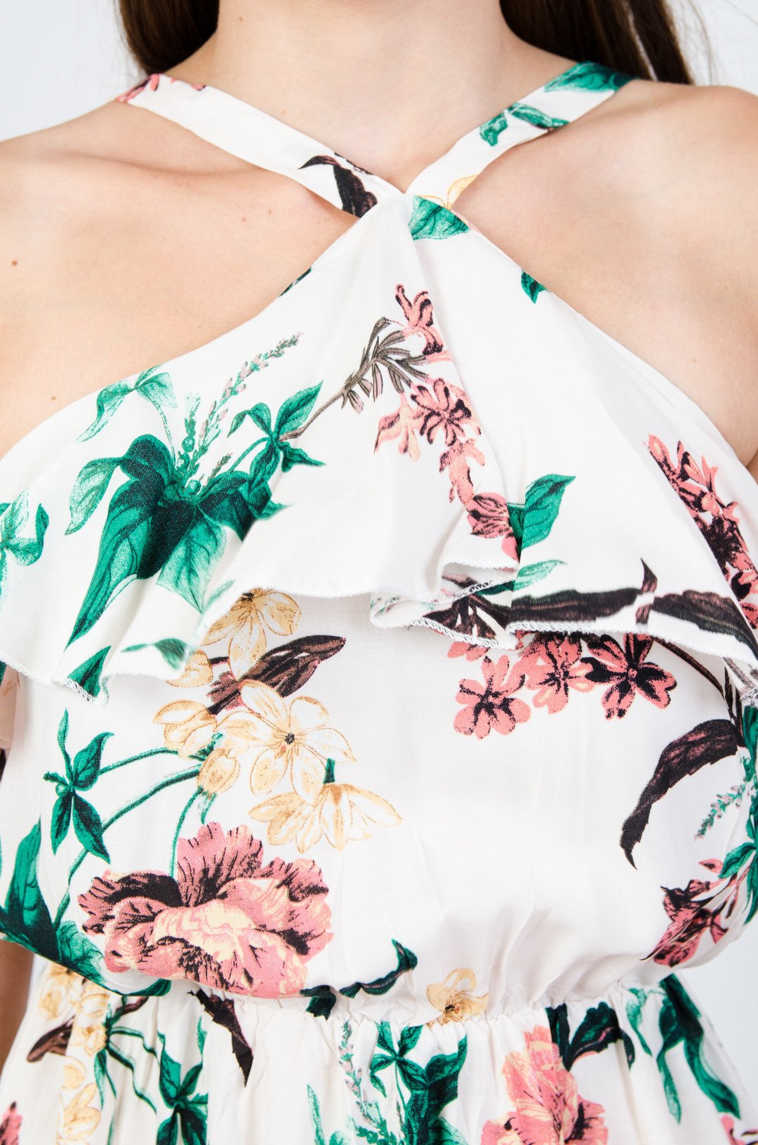Kremowa sukienka pod szyję w kwiaty- guma w pasie