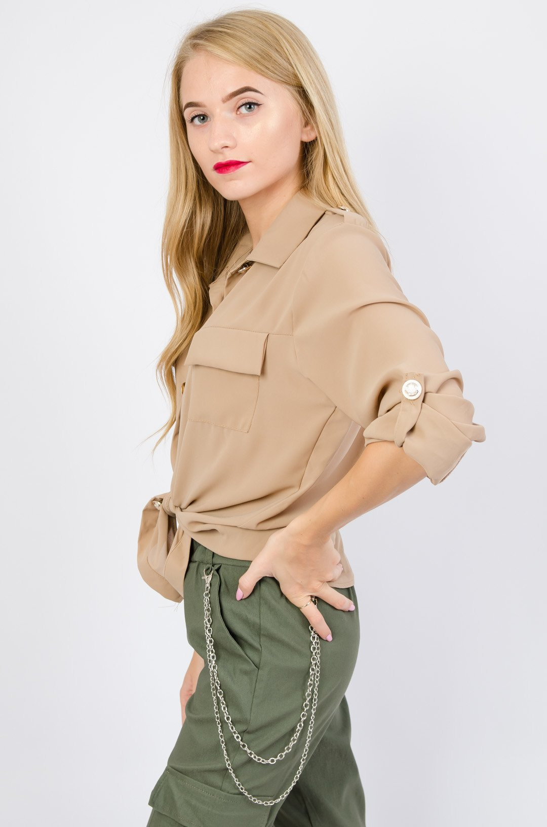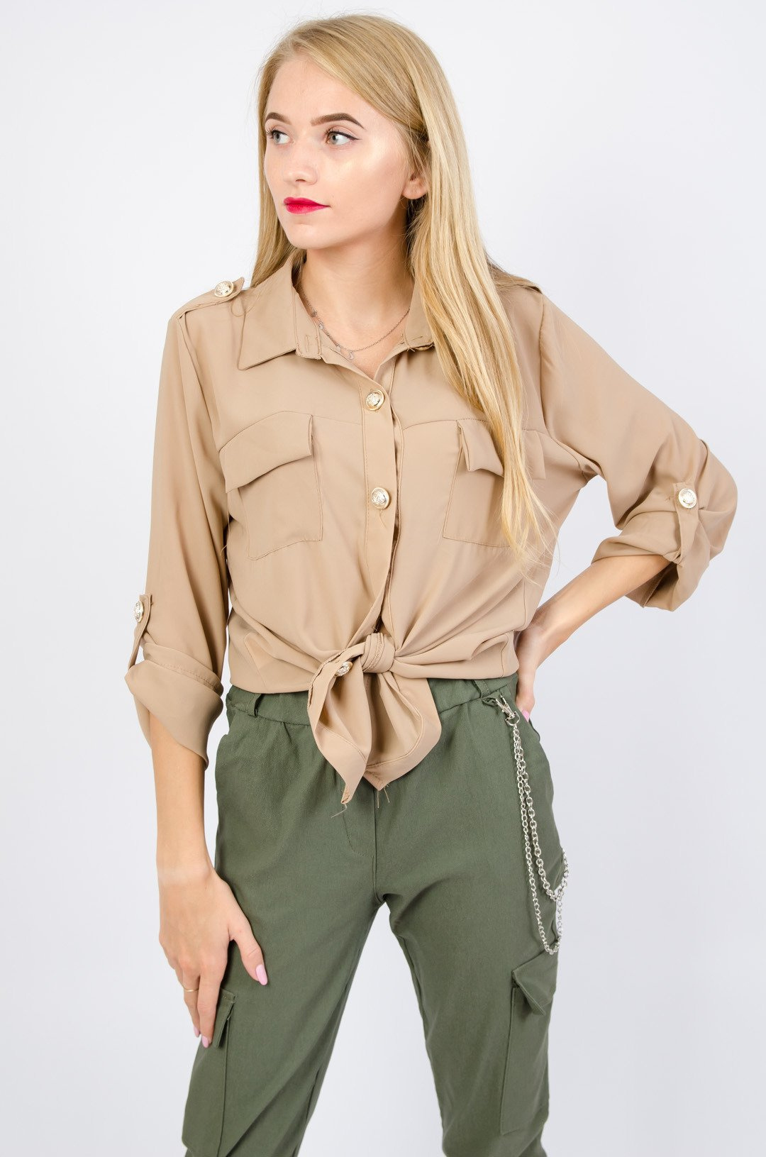 Brązowa bluzka koszulowa ze złotymi guzikami